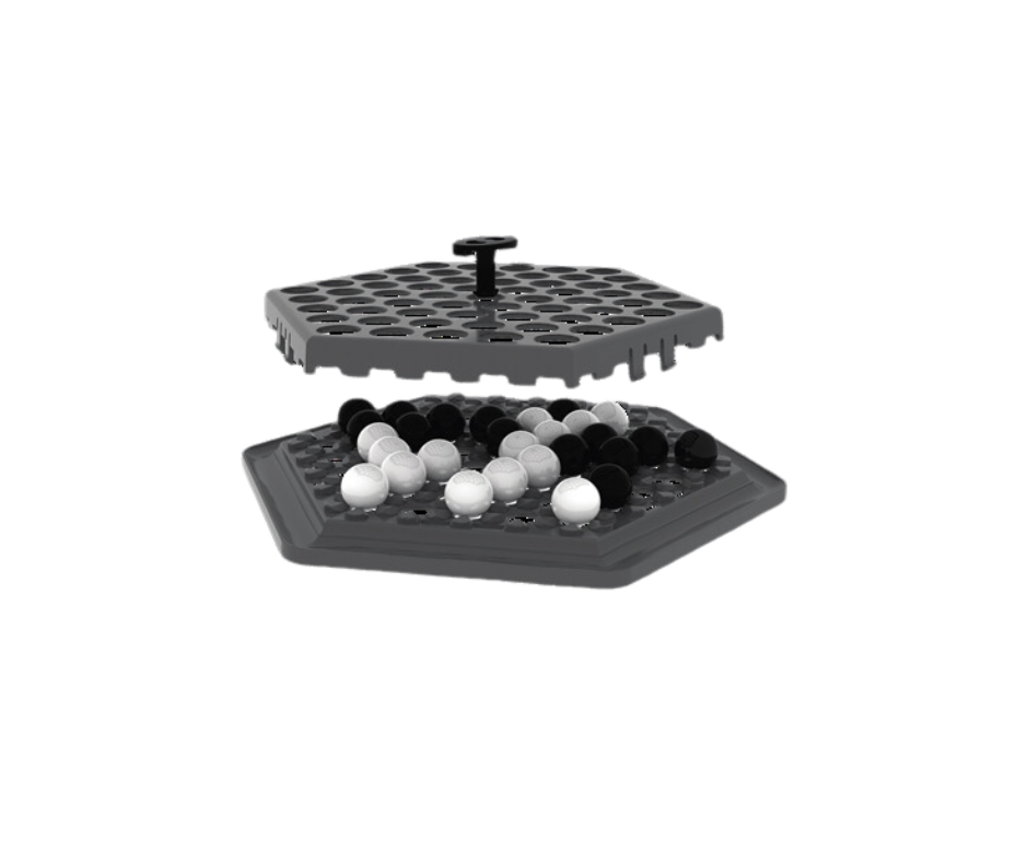 En Abalone dos bandos se enfrentan en un tablero hexagonal con bolas blancas y negras.