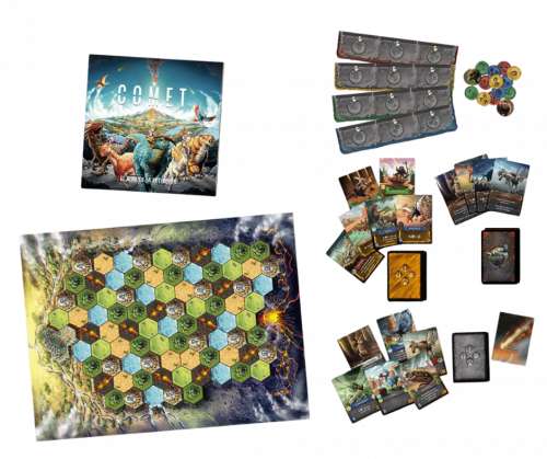 En Comet: El Alba de la Extinción, te transportas a una era prehistórica donde deberás actuar con inteligencia, estrategia y rapidez para rescatar a tantos animales como puedas antes de que caiga el cometa. Cada jugador toma el rol de un héroe rescatador —una criatura poderosa con habilidades únicas— y utilizará cartas de animales para eclosionarlos, moverlos por distintos terrenos y llevarlos a la gruta segura.