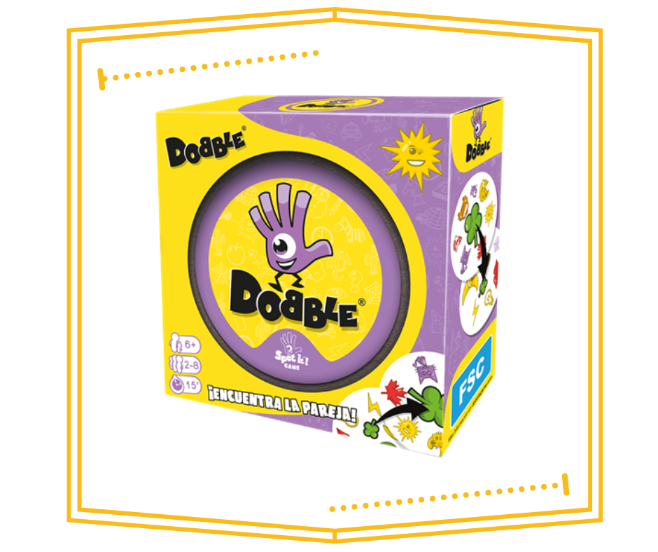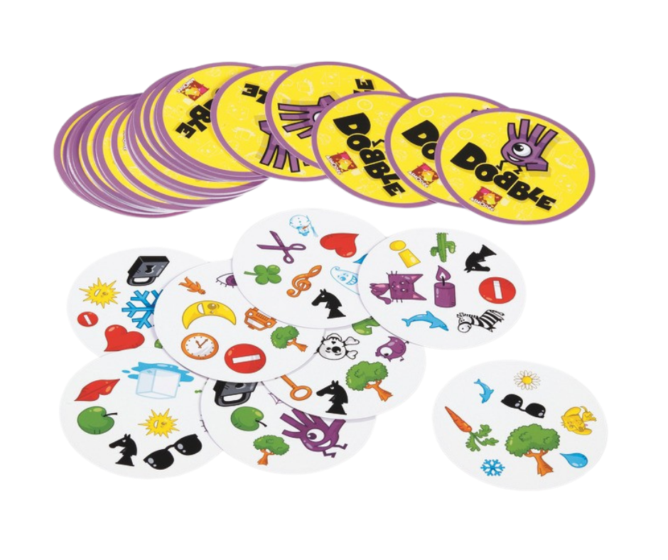 Dobble es un juego de cartas que se basa en la velocidad, observación y reflejos, en el que los jugadores compiten por encontrar el símbolo que coincide entre las cartas. Cada carta es única y sólo tiene un símbolo en común con cualquier otra del mazo. Puede ser difícil descubrir la coincidencia, ya que el tamaño y la posición de los símbolos pueden variar en cada carta.