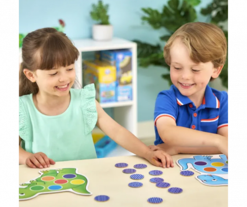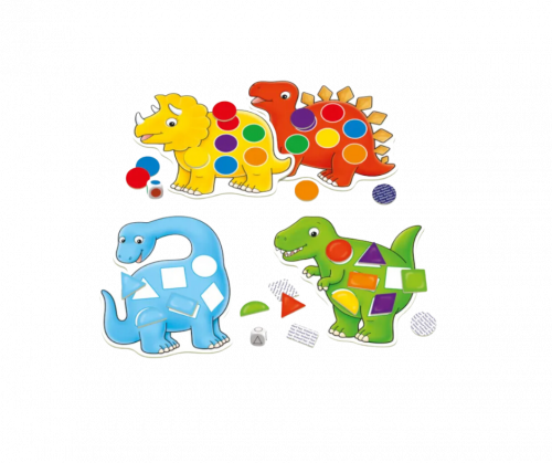 En un lado del tablero, los jugadores lanzan el dado de formas y buscan las piezas que encajen en los espacios correctos. En el otro lado, se usa el dado de colores para completar el tablero con los tonos correspondientes. ¡El primer jugador en llenar su dinosaurio gana!