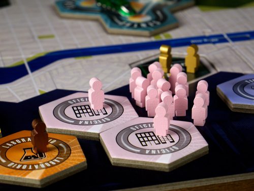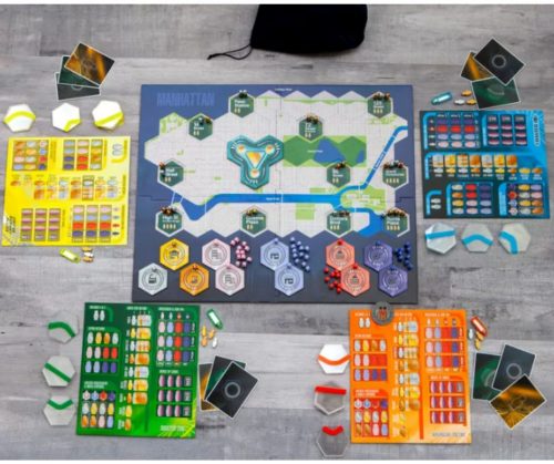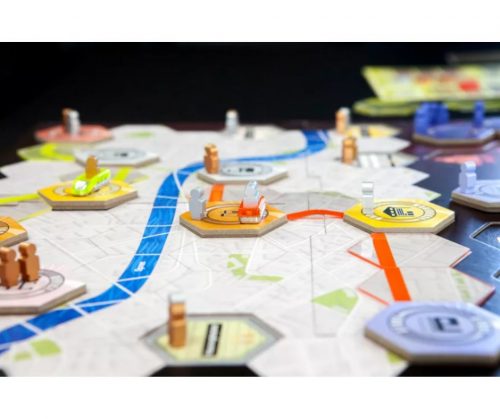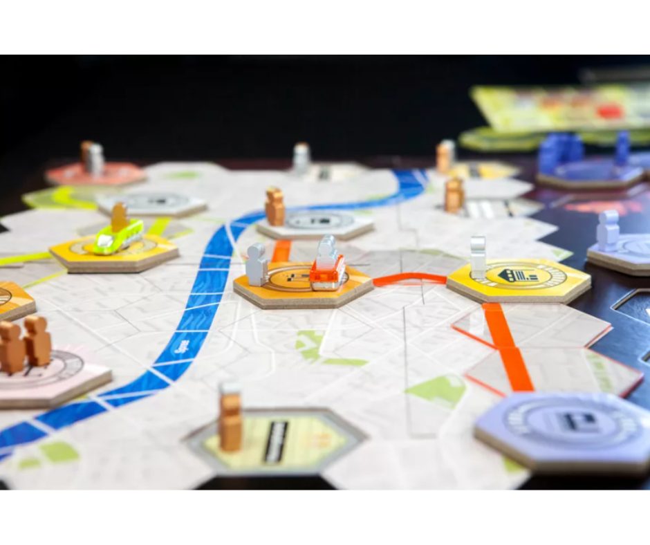 La eficiencia es la clave del éxito en este juego de construcción de motores, colocación de losetas, recogida y entrega. Las losetas transparentes permiten que tu ruta se superponga a las vías de tus oponentes, llevándote de una a otra estación.