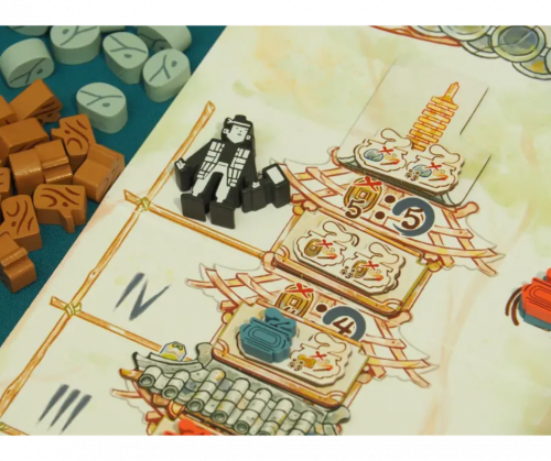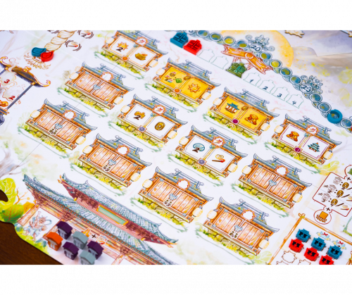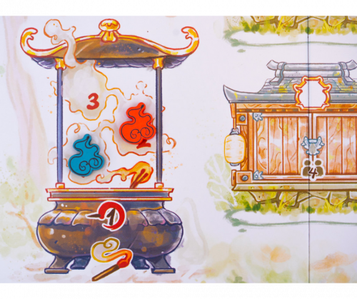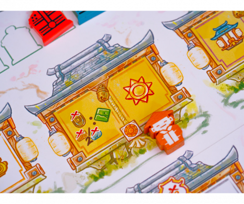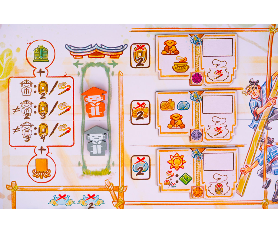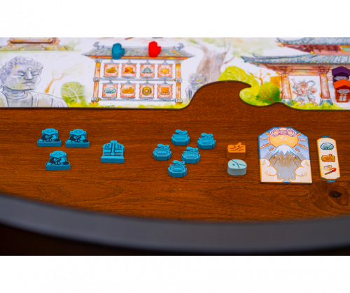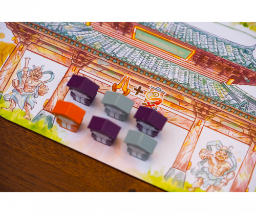 En tu turno, elige uno de los devotos disponibles en el torii y llévalo a un templo para resolver una acción. Puedes obtener recursos o realizar diversas acciones en los templos. También puedes llevar a tus monjes a las montañas, lo que te permite concatenar acciones adicionales y avanzar en el camino espiritual.