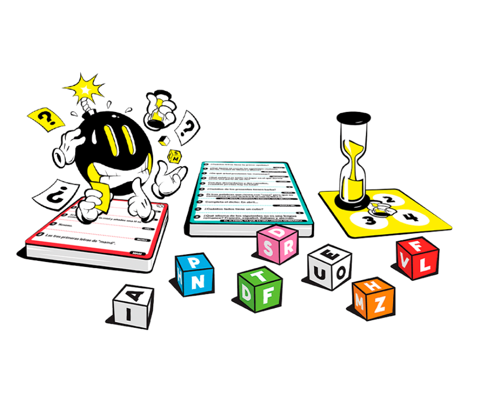 Responde verbalmente a uno de los jugadores mientras formas las respuestas para el otro jugador usando unos dados… todo esto mientras no le quitas un ojo de encima al reloj de arena para darle la vuelta en el momento preciso. ¡Está chupado! 😉