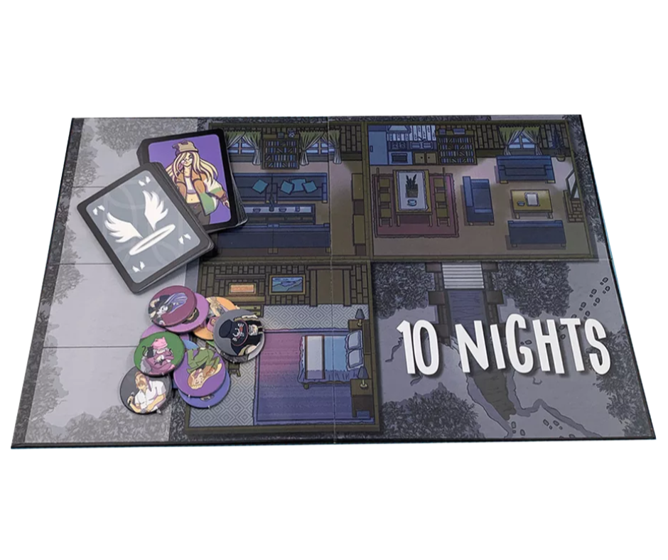 10 NIGHTS es un juego de roles ocultos que seguro que hará disfrutar a todos los jugadores. Este juego facilita unas reglas sencillas apoyadas en una app para controlar el tiempo de juego durante el día y la noche, así como un tablero de juego de la casa rural y fichas y cartas de los 12 personajes.