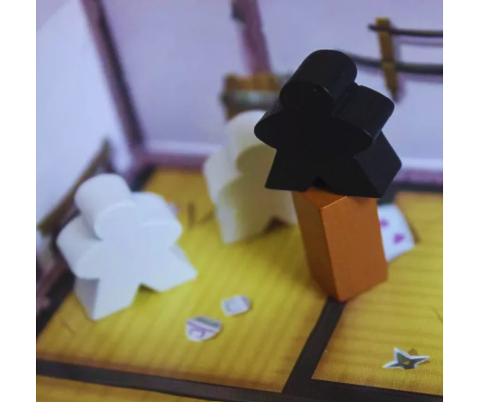 Para llevar a cabo los desafíos, Academia ninja pone a disposición de los jugadores diez meeples de ninjas (cinco negros y cinco blancos), otras diez figuras de troncos de madera, una carta de tatami por jugador y las dos partes de la caja. ¡Los ninjas no necesitan gran cosa para ponerse en forma!