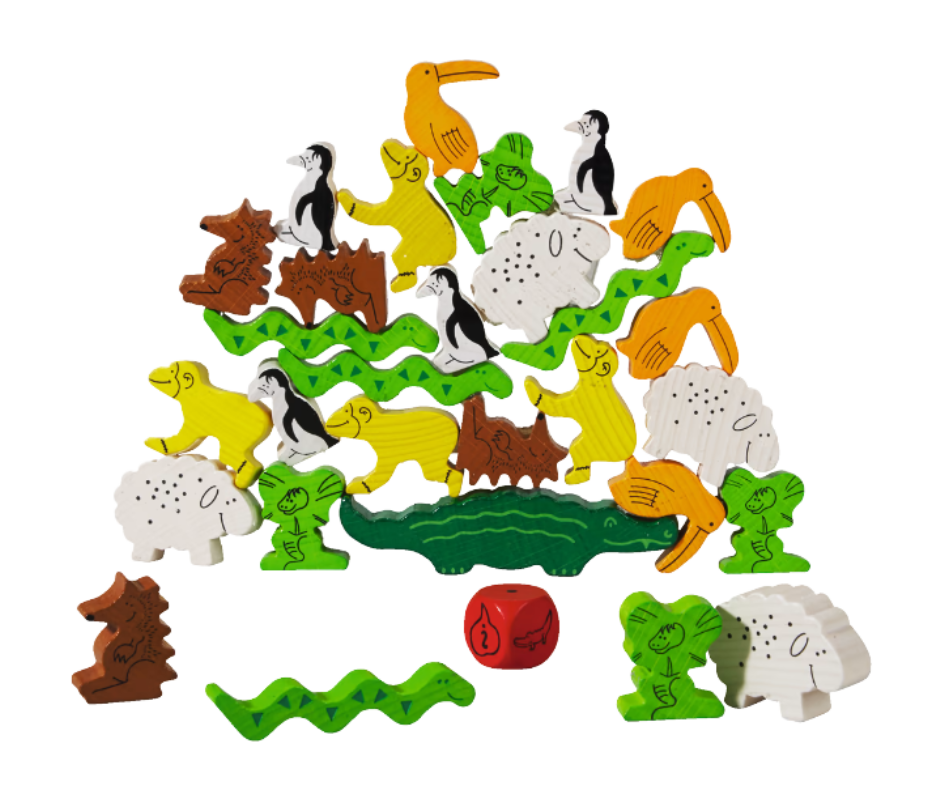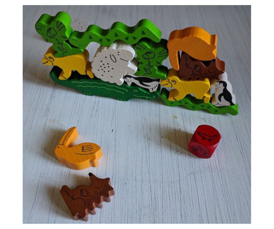 Por turnos, se lanza el dado y se realiza una de las acciones que indica: apilar uno o dos animales, darle un animal a otro jugador para que lo apile, colocar un animal que elijan los demás jugadores, colocar un animal al lado del cocodrilo…