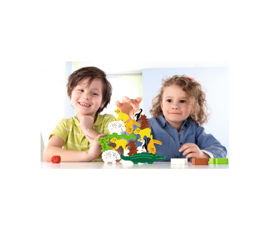 Ahora se requiere cuidado y mucho tacto. El mono debe subir al cocodrilo, la oveja al pingüino, la serpiente a la oveja… ¡no pierda el equilibrio! Gana el primero/a que apile todos sus animales a la altura de forma segura.