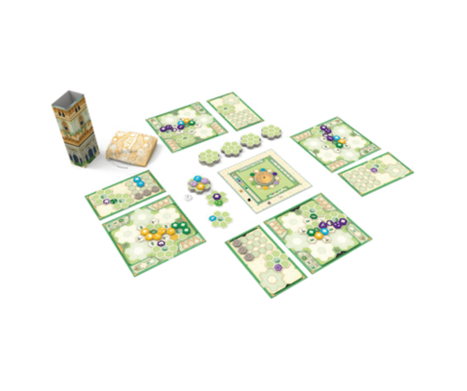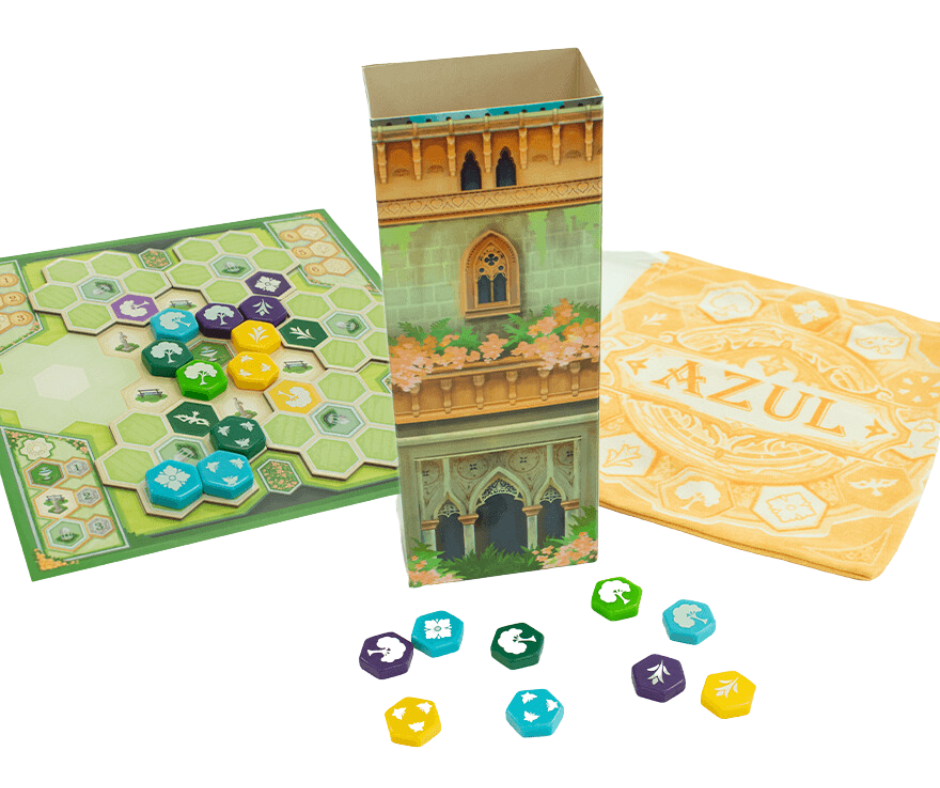 Lo primero que llama la atención de Azul: Jardín de la Reina es la inclusión de una pequeña torre de cartón que refleja a la perfección el tema del juego, que nos convertirá en diseñadores de jardines al servicio del Rey Manuel I de Portugal. Además, el tablero principal contiene un dial que los jugadores irán haciendo girar para reflejar las bonificaciones de las puntuaciones actuales.