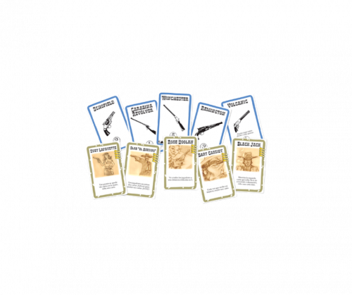 Armas (cartas azules): Revólveres, Winchester, o incluso la poderosa Gatling (que afecta a todos a la vez, ¡sin importar el alcance!). Mejoran tu capacidad de ataque y te dan ventajas estratégicas.