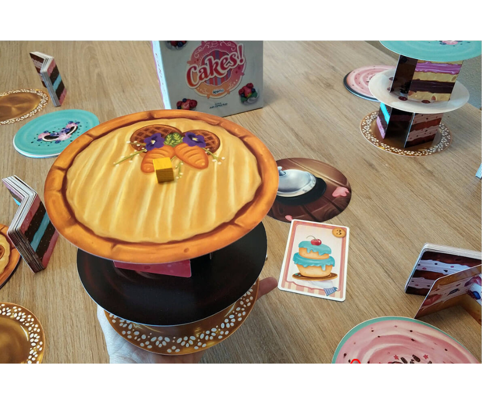 Los jugadores colocan sus platos en sus manos. Encima de estos platos, apilarán las capas de sus pasteles según la carta de Orden (una capa, dos capas…). Para ello, cada jugador roba 2 cartas de Bizcocho y las coloca de forma que pueda poner una carta de Glaseado encima del Bizcocho. En los siguientes turnos, apilarán capas encima de las que ya están en sus Platos.