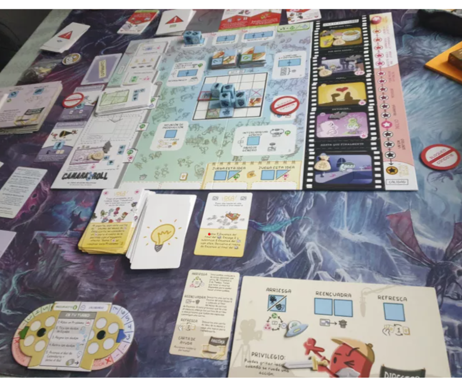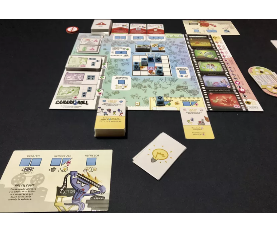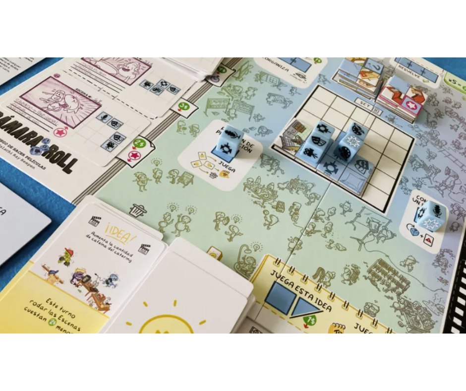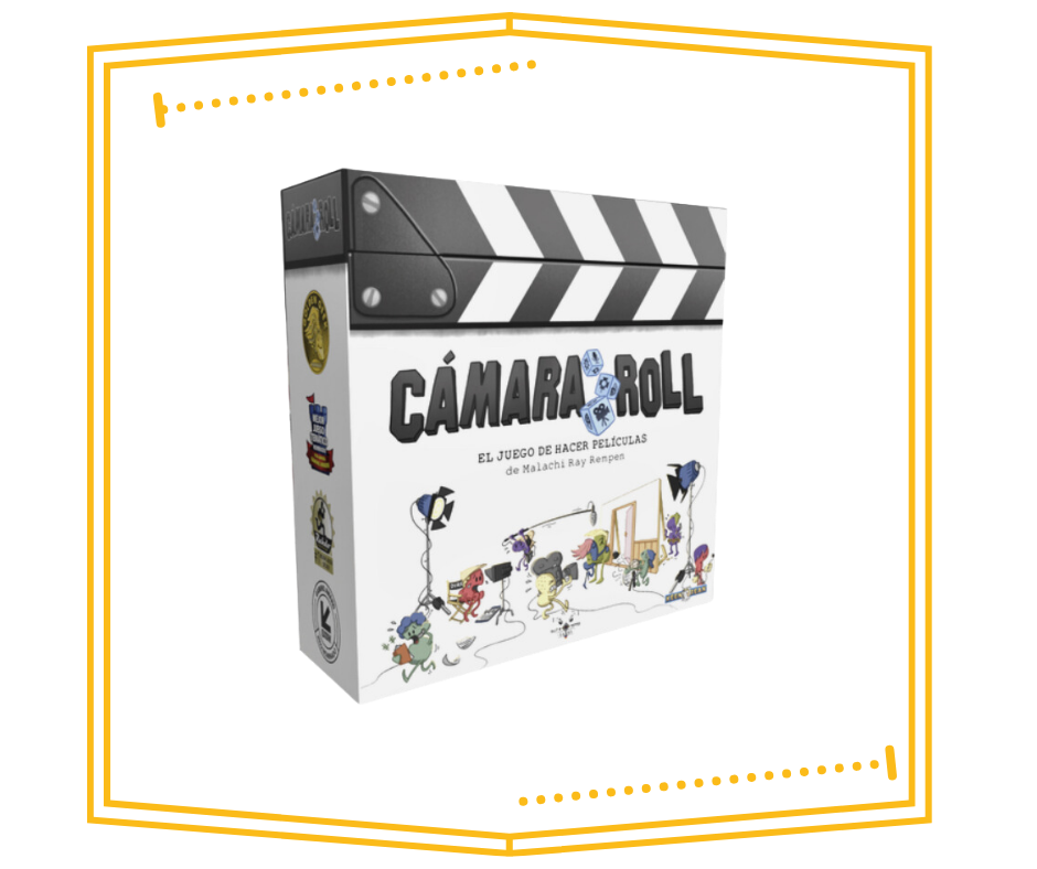 Cámara Roll es un juego de gestión de recursos en solitario o cooperativo en el que se colocan dados (los trabajadores) y se crea un rompecabezas geométrico central que representa la disposición de la filmación. Lanzas los dados personalizados D6 Crew, cada cara representa un departamento de producción diferente (cámara, luz, sonido, actores, diseño de produccióCámara Roll es un juego en el que intentarán rodar una película de éxito, para lo cual tendrán que utilizar todos los recursos que encontrarán a su disposición. No podrán pasarse del presupuesto que tienen asignado ni tampoco pasarse del tiempo previsto y, además, deben conseguir que el resultado tenga la calidad suficiente como para conseguir todo un éxito de taquilla. n, efectos visuales) y los asignas a acciones, ya sea en el tablero principal o en tus tableros de jugador individuales. Tu tablero de jugador presenta un jefe de departamento específico (director, productor, director de fotografía, editor, diseñador de producción o la estrella) y contiene espacios de acción únicos que se pueden usar en tu turno.
