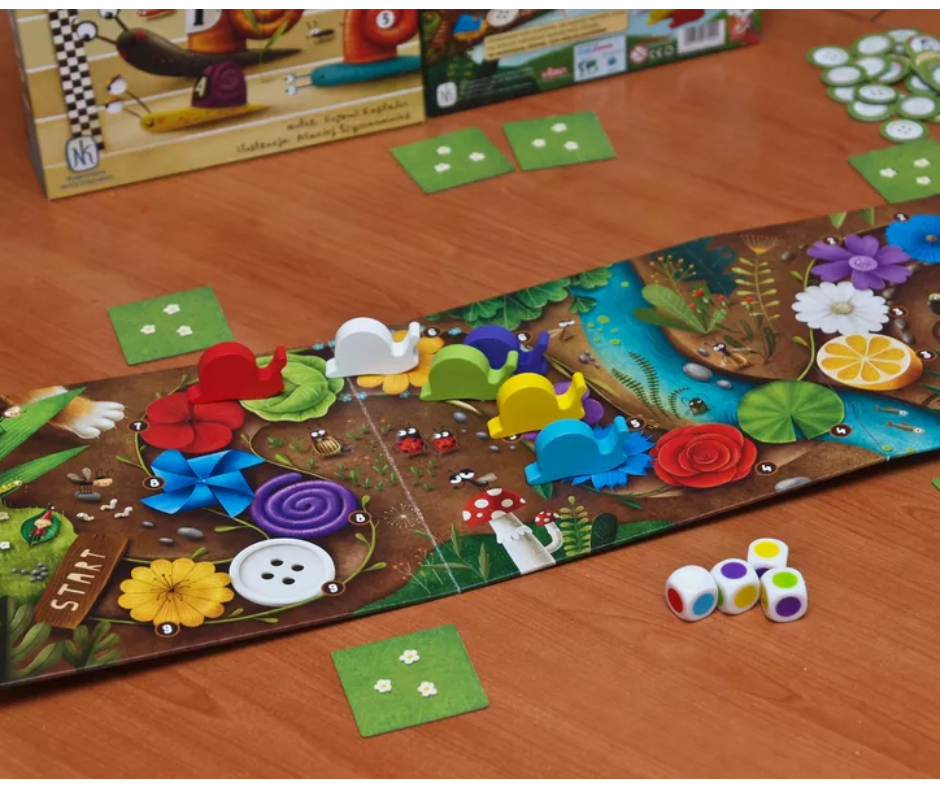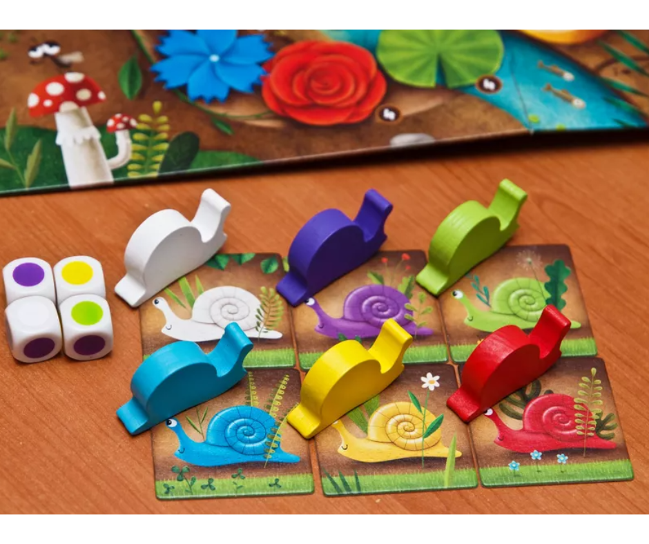 Los jugadores “pilotarán” un caracol de carreras cada uno y mediante tiradas de dados de seis colores harán avanzar los caracoles por un circuito de flores, frutas, etc.. intentando no mover su caracol para poder estar en la última posición cuando un caracol cruce la linea de meta.