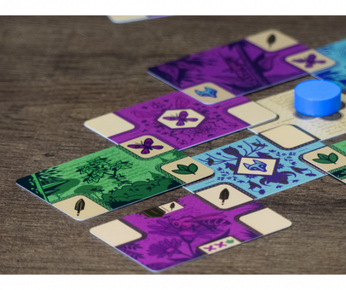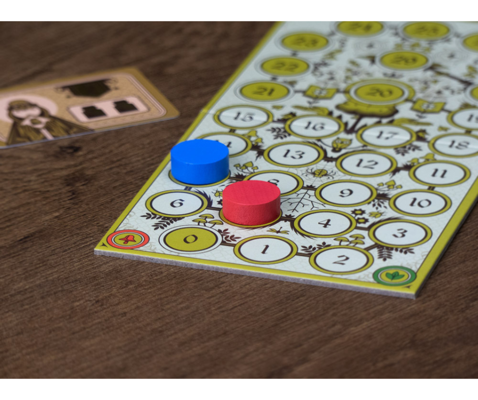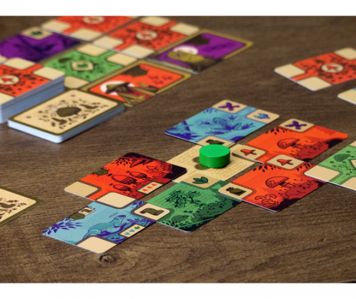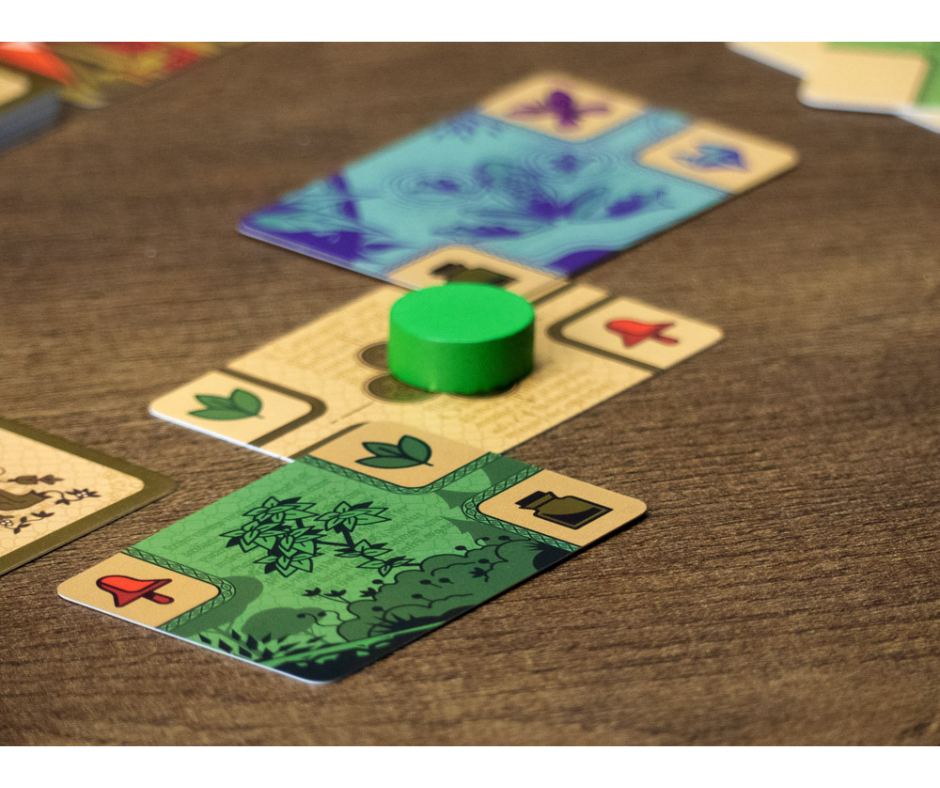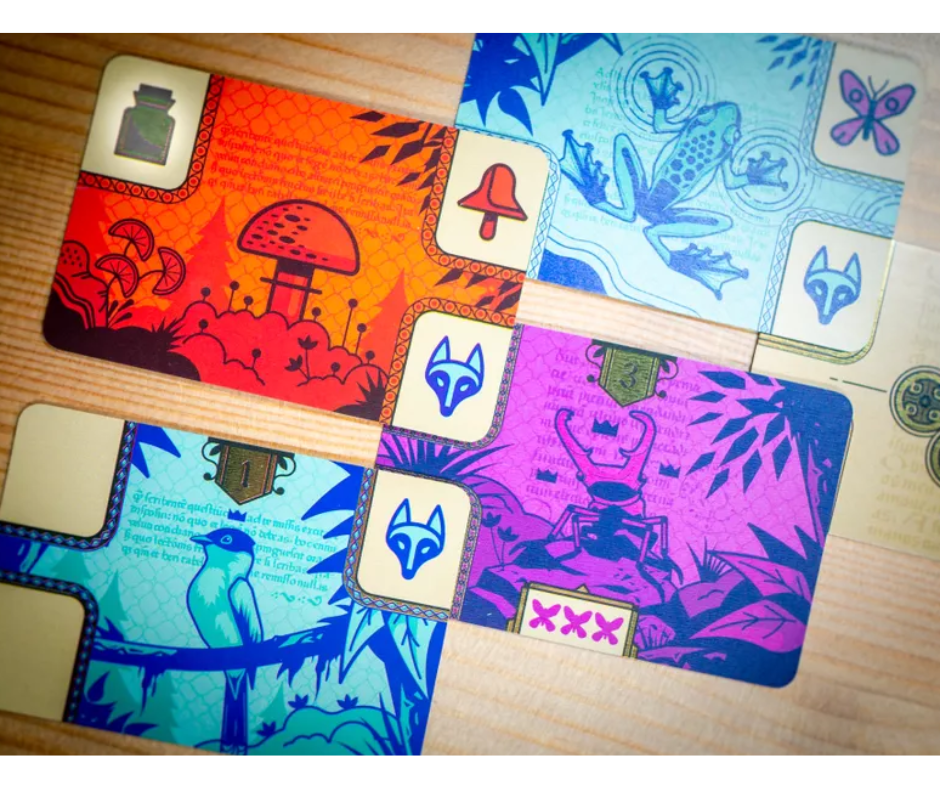 Las cartas doradas otorgan puntos cuando se juegan, pero a menudo requieren un recurso, por ejemplo, tres hongos o dos plantas/un animal/un insecto, y debes tener esos recursos visibles en tu manuscrito en el momento de jugar la carta dorada. Obtienes puntos con esta carta de inmediato, algunas cartas tienen un valor fijo y otras uno variable dependiendo de cuántos símbolos determinados se muestran o cuántas esquinas cubriste este turno.