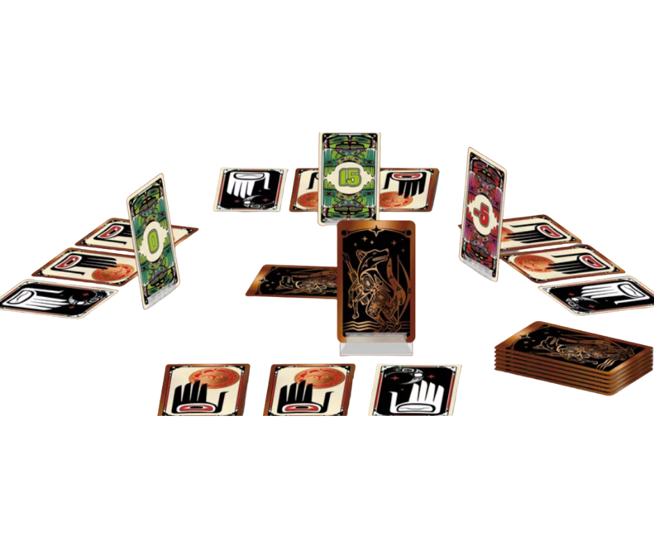 El estilo tradicional de la costa noroeste y los detalles metálicos en cobre (símbolo de prosperidad) hacen que cada carta sea una pieza de colección. Es, posiblemente, uno de los juegos más bellos de nuestra estantería.