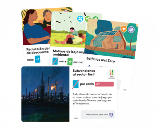 Puntos de Inflexión y Crisis: El juego no te lo pone fácil. Cada banda térmica que alcanza el termómetro obliga a lanzar un dado de efectos planetarios, representando puntos de inflexión ecológicos críticos. ¡Y cuanto más sube la temperatura, más cartas de crisis deberás robar! Estas cartas reflejan los diversos y devastadores impactos del cambio climático en el planeta, añadiendo una capa constante de desafío.