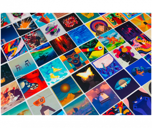 La carta de portada escogida se coloca aún un lado de la zona de juego, formando una cuadrícula de 3 filas por 3 columnas. De esta manera, al final de la partida pueden contemplar su mosaico de portadas escogidas.