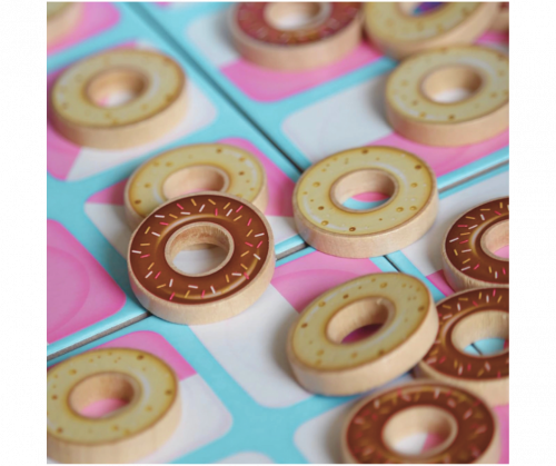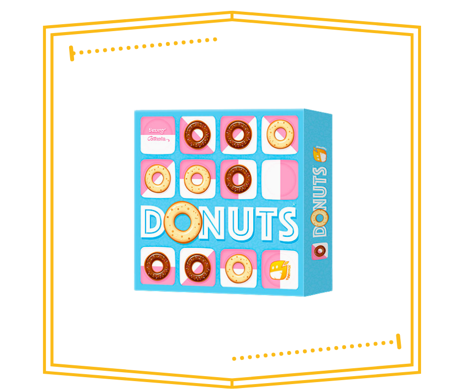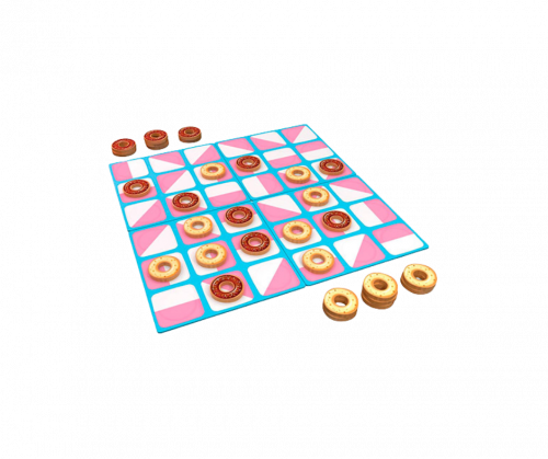 Donuts es un duelo táctico y dulce para 2 jugadores. El objetivo del juego es conseguir alinear 5 donuts impidiendo al oponente que convierta tus donuts a su sabor al insertar uno de sus donuts en tu línea previa.