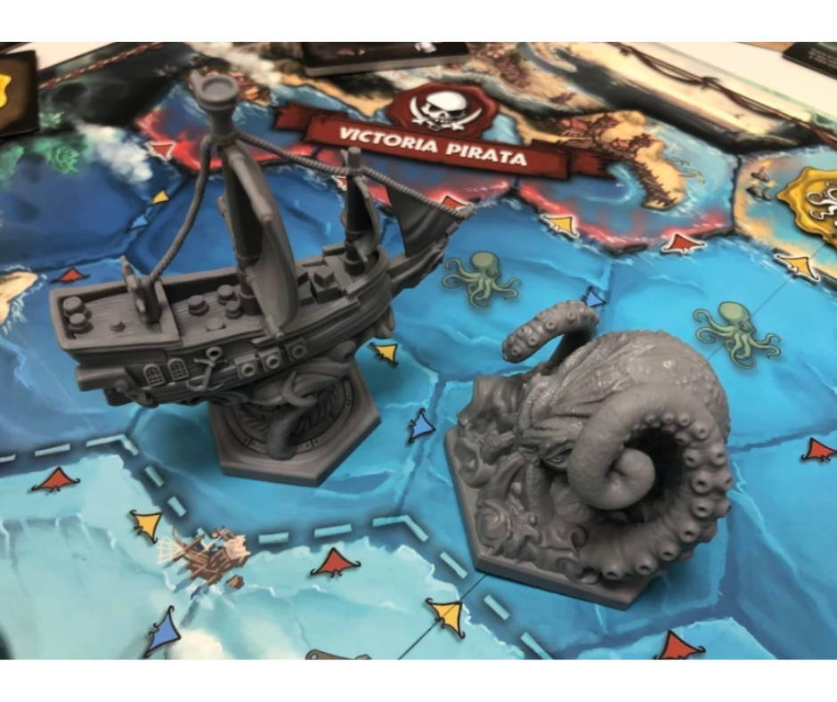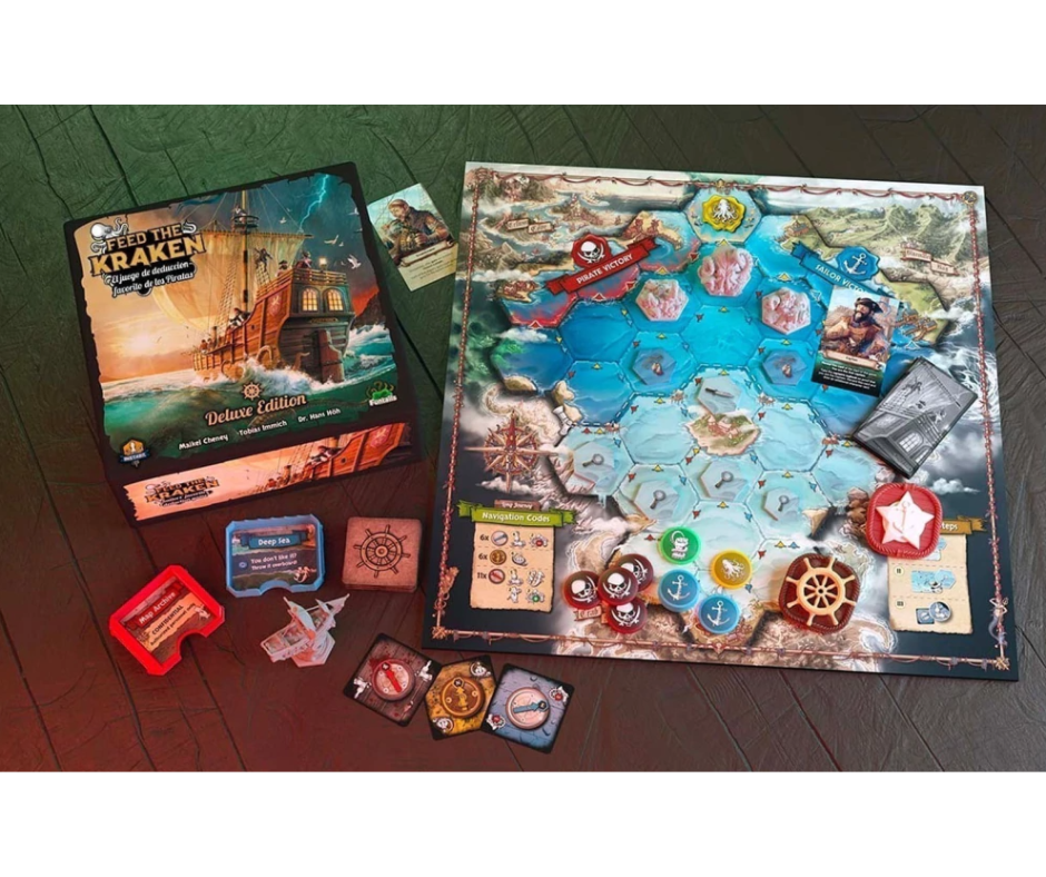 Feed the Kraken es un juego de deducción de roles ocultos, con tres facciones asimétricas . Puede que todos los jugadores estén sentados en el mismo barco, ¡pero quieren navegar en diferentes direcciones! Los marineros leales deben llevar el barco sano y salvo a tierra firme, mientras que los piratas anhelan maniobrar en secreto el barco hasta el Triángulo de las Bermudas. Mientras tanto, un cultista loco está ocupado convenciendo a partes de la tripulación para que lo ayuden a invocar a su señor oscuro , el Kraken, desde las profundidades del mar para salvarlos a todos.