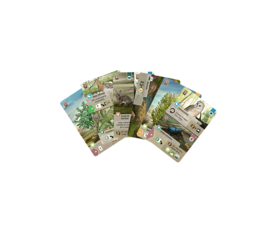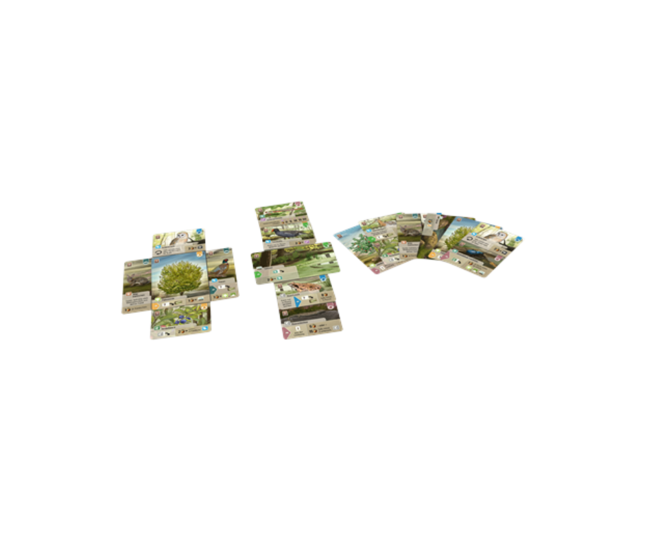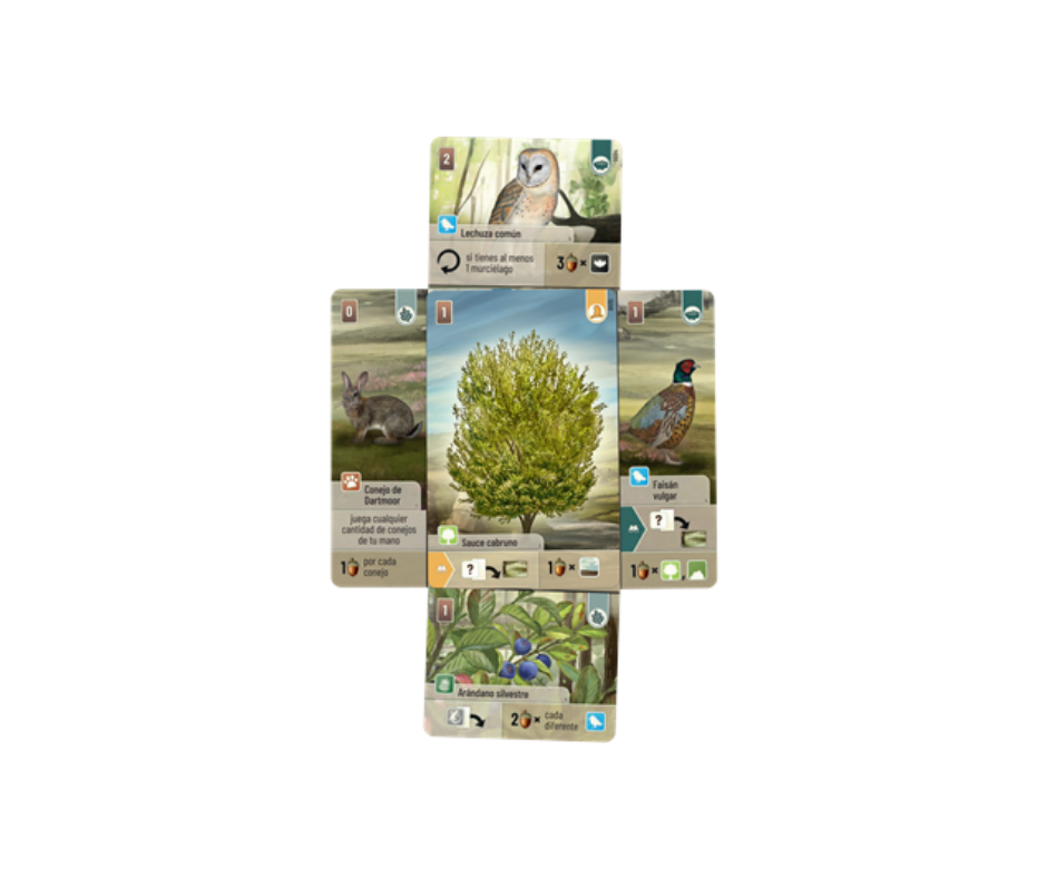 A diferencia de los árboles y arbustos, los terrenos se juegan de forma horizontal. Esto cambia el tablero por completo. Ahora los animales no solo se colocan a los lados, sino que en el terreno solo puedes poner habitantes arriba y abajo. Esto te obliga a replantearte toda tu zona de juego para no bloquear bonificaciones clave.