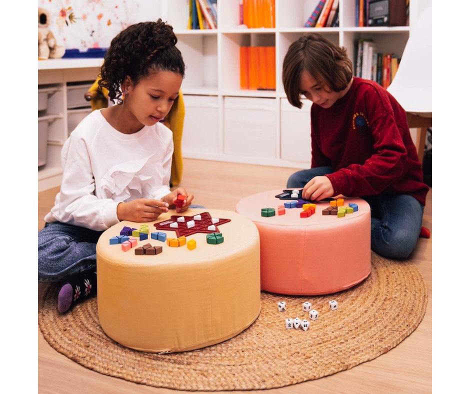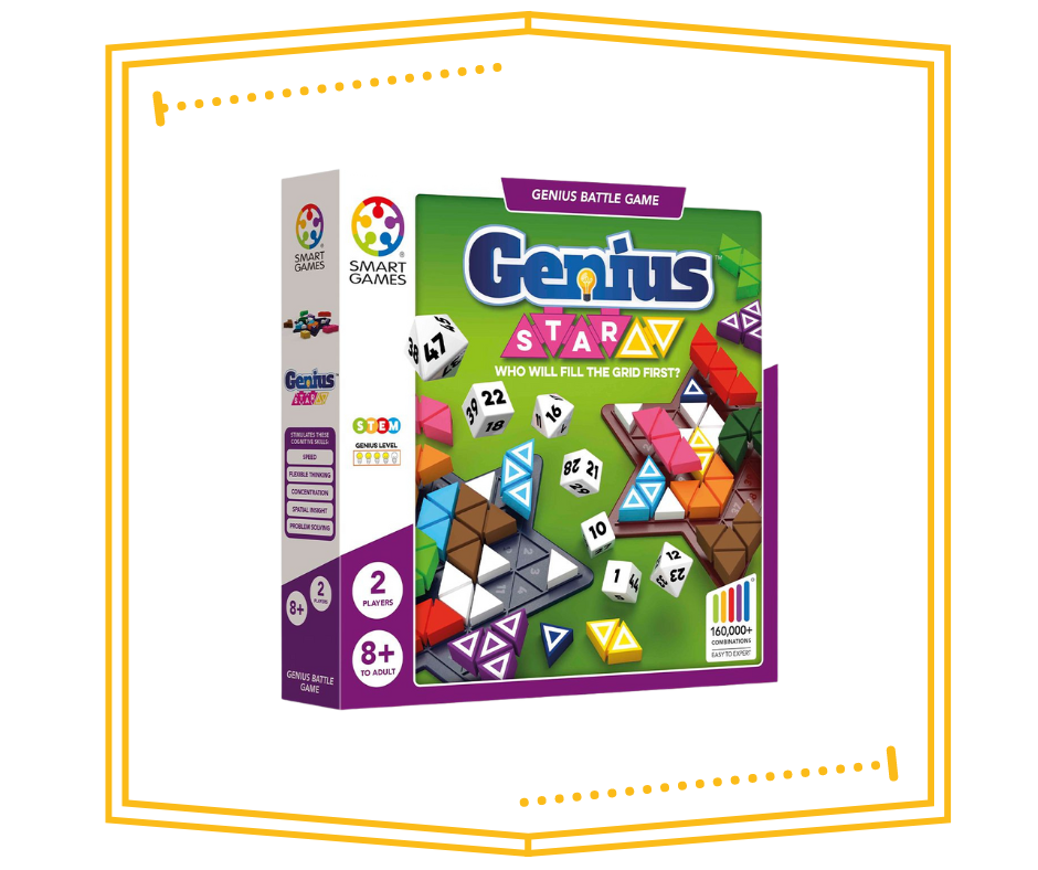 ¡Conviértete en la estrella del juego! Piensa rápido para resolver los desafíos antes de que tu rival alcance el nivel más alto. Tira los dados, coloca las 7 piezas café circulares a las que llamaremos “bloqueadores” en el tablero de juego y completa la estrella usando las 11 piezas restantes antes que el otro jugador.