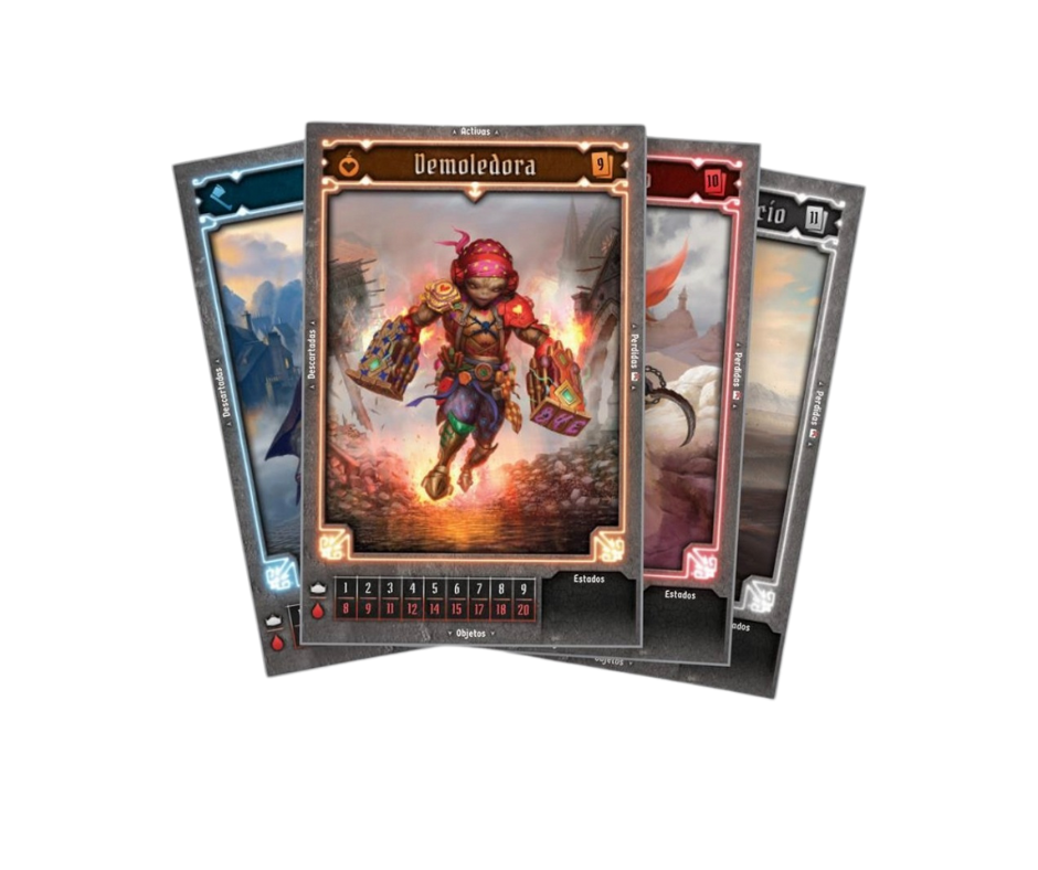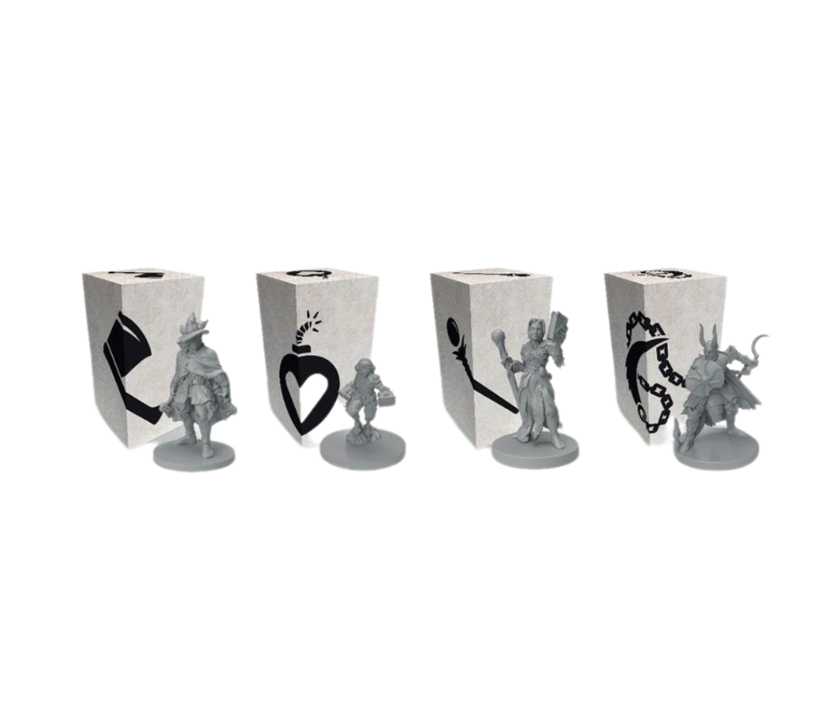 Cuatro (4) personajes con sus correspondientes miniaturas, mazos y hojas de personaje