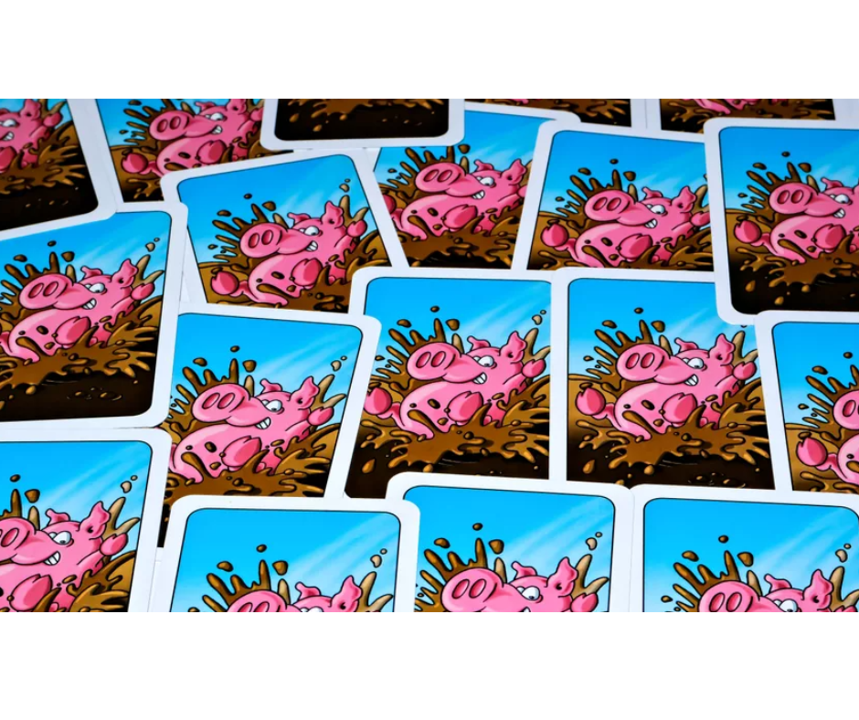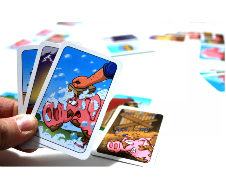 En este sencillo y rápido juego de cartas deberás conseguir que todos tus cerdos se embarren antes que los del resto para ganar. Limpia a los cerdos de los demás, evita la lluvia y al granjero con su cepillo y esconde a tus cerdos en el establo para ponerlos a salvo ¡en su feliz inmundicia!
