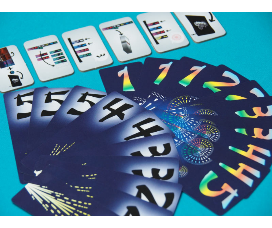 La primera es Avalancha de colores, que presenta 10 cartas con fuegos de diferentes colores. Estás actúan como un color completamente nuevo, contando como TODOS los colores a la hora de dar pistas. Ahora habrá que conseguir construir 6 fuegos artificiales, y la puntuación máxima es de 30 puntos.