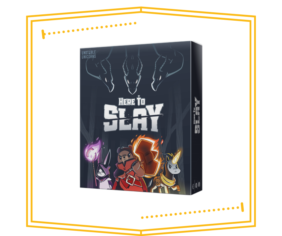 Here to Slay es un juego de rol competitivo de cartas de estrategia y fantasía que consiste en reunir un grupo de héroes y matar monstruos (y a veces también sabotear a tus amigos) de los creadores de Unstable Unicorns.
