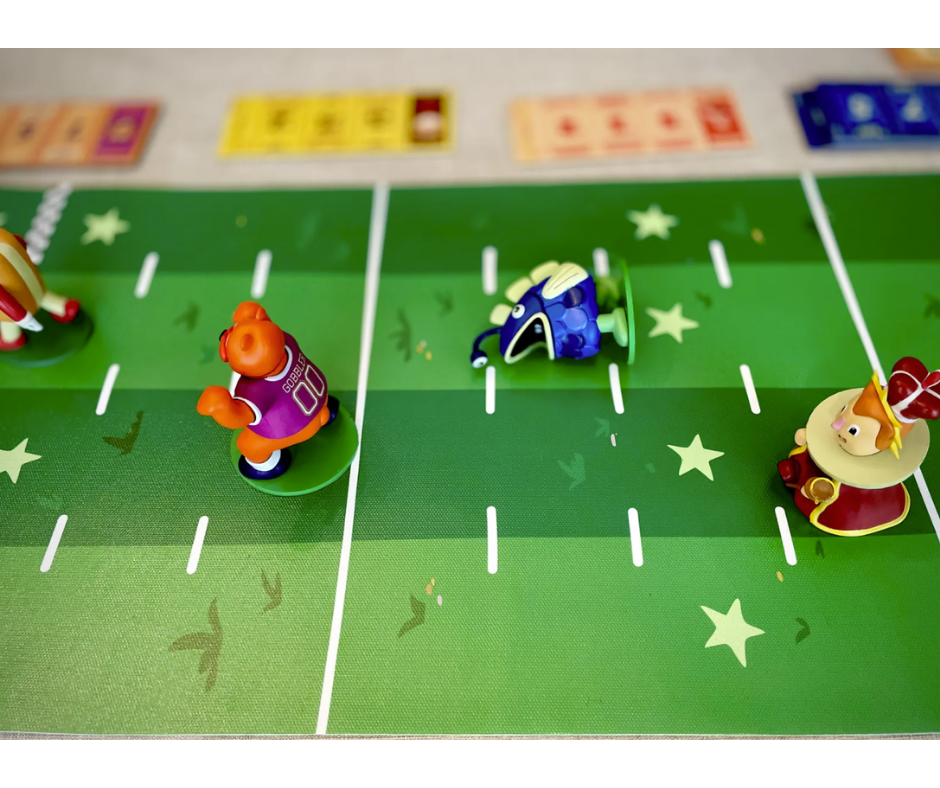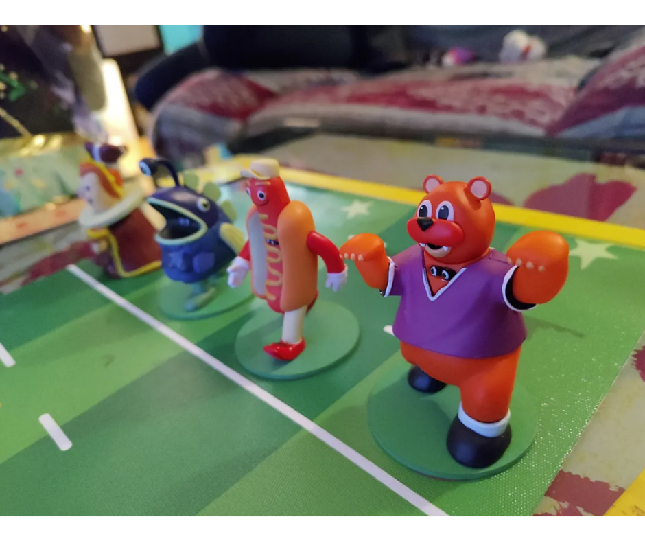 Las 4 figuras de mascotas son grandes y gruesas, y la pista de carreras es una locura desplegable y ridículamente larga que ocupa el centro de la mesa y atrae todas las miradas.