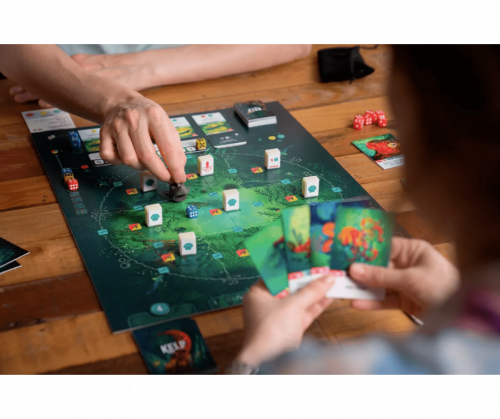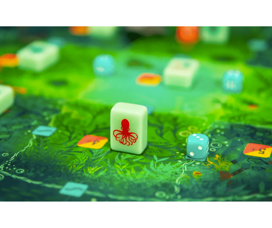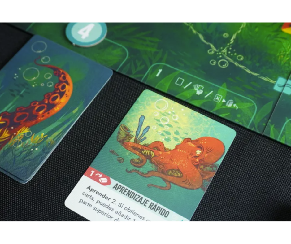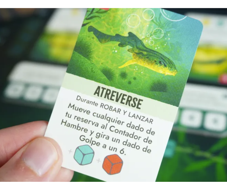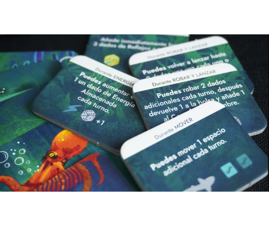 Por un lado, tienes al pulpo, reconocido por su astucia y habilidad para camuflarse, quien utiliza un ingenioso sistema de construcción de mazos y gestión de bloques ocultos para moverse sigilosamente y evadir a su rival. Por otro lado, el tiburón-gato, un depredador implacable, patrulla con fuerza y utiliza dados y habilidades especiales para cazar a su presa.