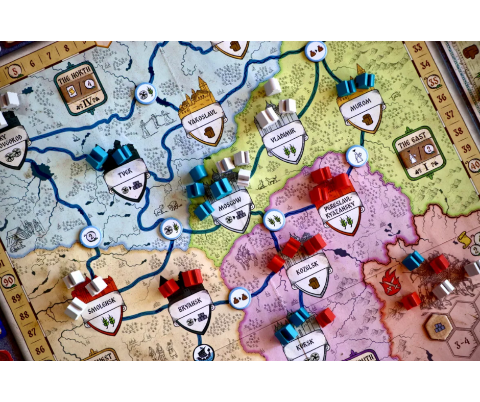 Control Territorial: Coloca a tus boyardos y guerreros en el mapa para fortificar ciudades y dominar las cuatro regiones principales, obteniendo recompensas adicionales al final de cada década.