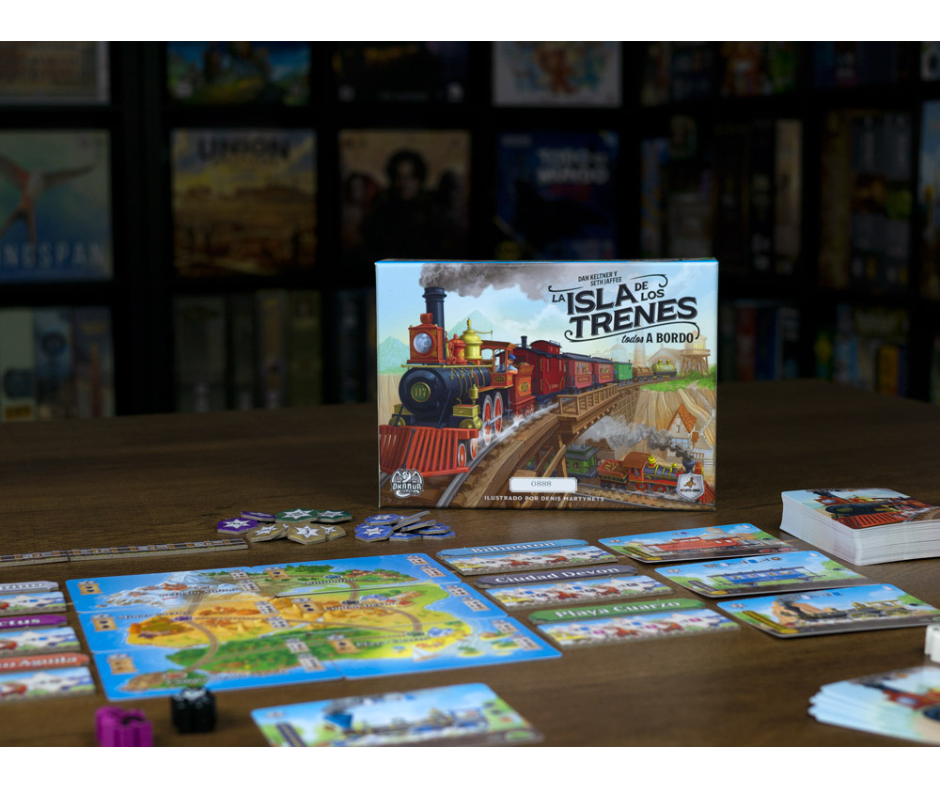 Isla de los Trenes: Todos a Bordo se trata de equilibrar la necesidad de mejorar tu tren, cargar carga o pasajeros en el tren del oponente para obtener grandes bonificaciones y entregar carga y pasajeros a sus destinos antes que nadie. ¡Construye tu locomotora con la suficiente eficacia para ser recordado como el mejor conductor de trenes de la Isla de los Trenes!