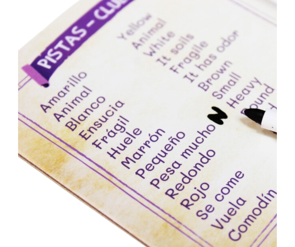 Apuntarán pistas en sus pizarras para intentar relacionarlas con los objetos del centro de la mesa. Las cartas especiales están pensadas para dar pequeños giros a la investigación.