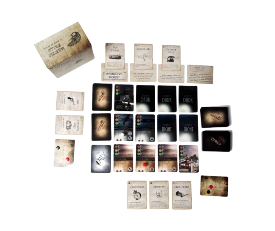 Inspirado en los sombríos mundos del cine negro, Mantis Falls es un viaje temático que requiere que los jugadores sopesen continuamente el valor de la cooperación frente a los peligros implícitos de la confianza. La gestión de manos y el juego de cartas boca abajo se combinan con oportunidades de traición para crear una combinación detallada de estrategia, interacción del jugador y sospecha. En cada turno, los jugadores hacen movimientos ocultos y desarrollan planes ocultos, pero también tendrán conversaciones profundas mientras discuten tácticas, defienden opciones y fanfarronean para proteger secretos cuidadosamente guardados.