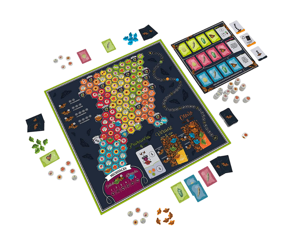 De México a Norteamérica y volver. Año tras año millones de mariposas hacen este viaje homérico, apareándose y sobreviviendo a todo tipo de adversidades. En este evocador juego, serás tú el que consiga terminar el viaje con la mayor familia de mariposas en el tablero?