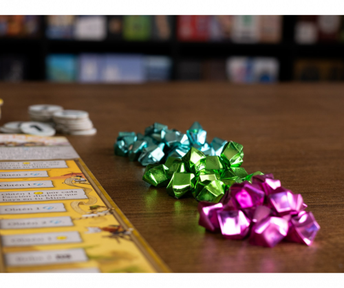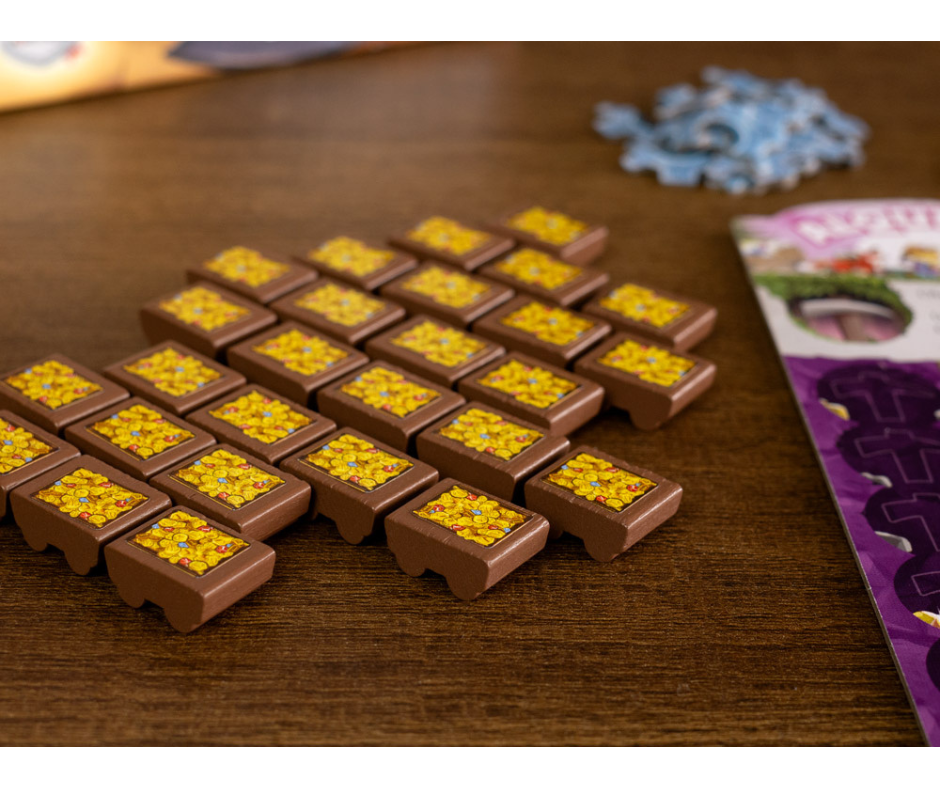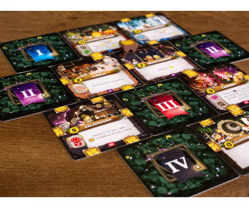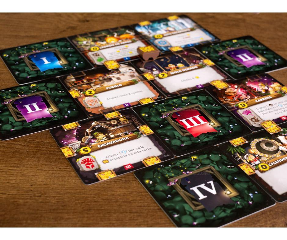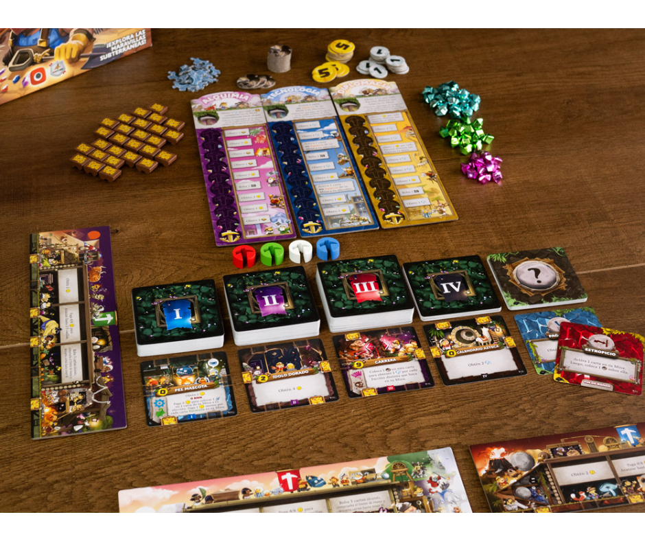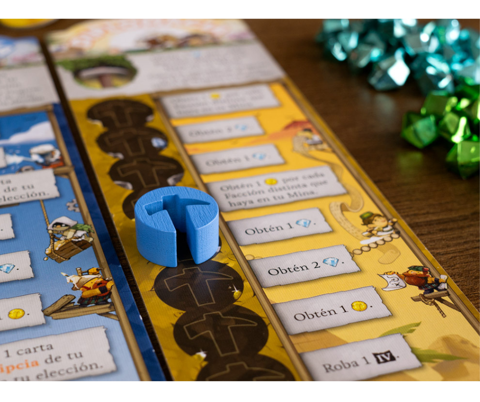 Mientras desarrollan sus minas, los jugadores también avanzan en los tableros de progreso. Durante la preparación, se eligen al azar tres de los seis tableros de progreso disponibles para el juego. Cada uno de estos tableros ofrece un enfoque estratégico diferente. A lo largo del juego, los jugadores avanzan para obtener bonificaciones adicionales que los ayudan a desarrollar sus tableros, activar las sinergias entre las cartas, ganar puntos de victoria y lograr combos aún más satisfactorios. La combinación de tableros de progreso influye en las estrategias y hace que el juego sea diferente cada vez que juegas.