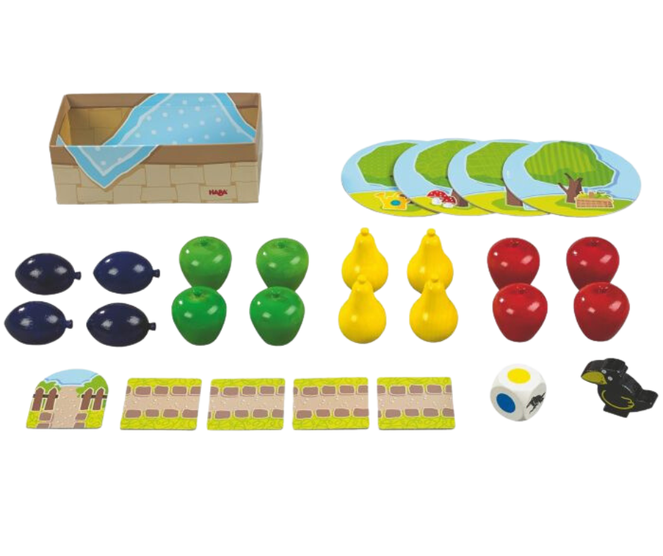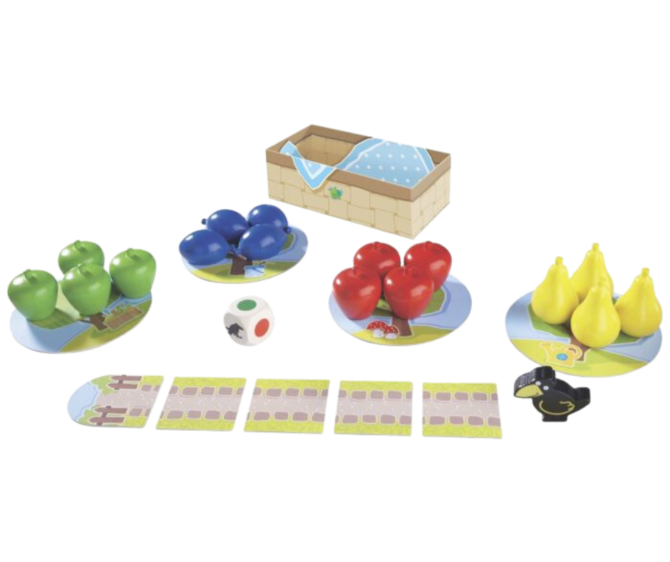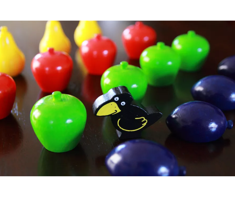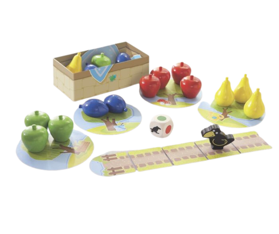 Si los jugadores logran cosechar toda la fruta antes de que el cuervo llegue al huerto, ¡ganarán juntos! Si el cuervo llega primero, perderán juntos contra el cuervo veloz y voraz.