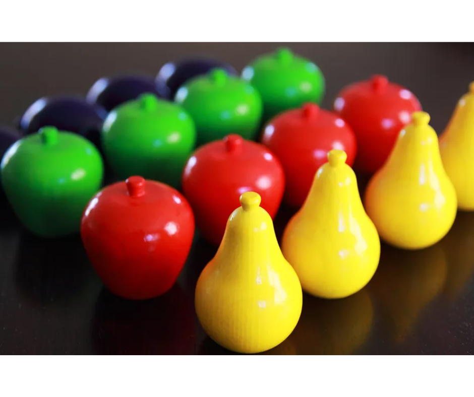 ¡La robusta cesta de frutas ofrece otro juego por sí sola! La fruta de madera maciza se puede utilizar para el juego (con tableros y dados) y también como comida de juguete para la cocina de juguete.