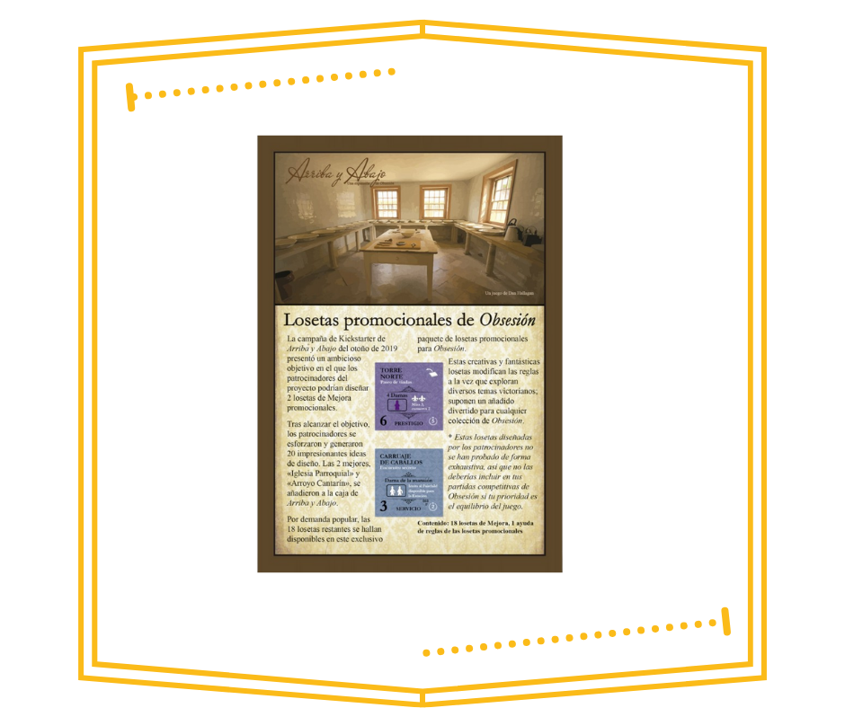 Las dieciocho (18) fichas promocionales restantes están disponibles ahora como un artículo separado. Estas fichas de mejora abarcan todas las categorías de fichas: siete de SERVICIO, dos de FINCA, dos de ELEMENTOS ESENCIALES, tres de PRESTIGIO, una de DEPORTES y tres fichas ESPECIALIZADAS (una híbrida, una comodín y una ficha prototipo).