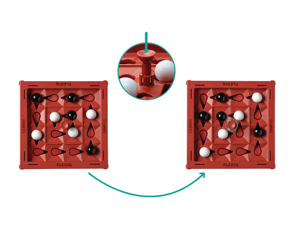 Pero ¡cuidado! Para finalizar tu turno, debes presionar el botón Orbito. ¡Esto hace que TODAS las canicas se muevan 1 posición en su órbita!