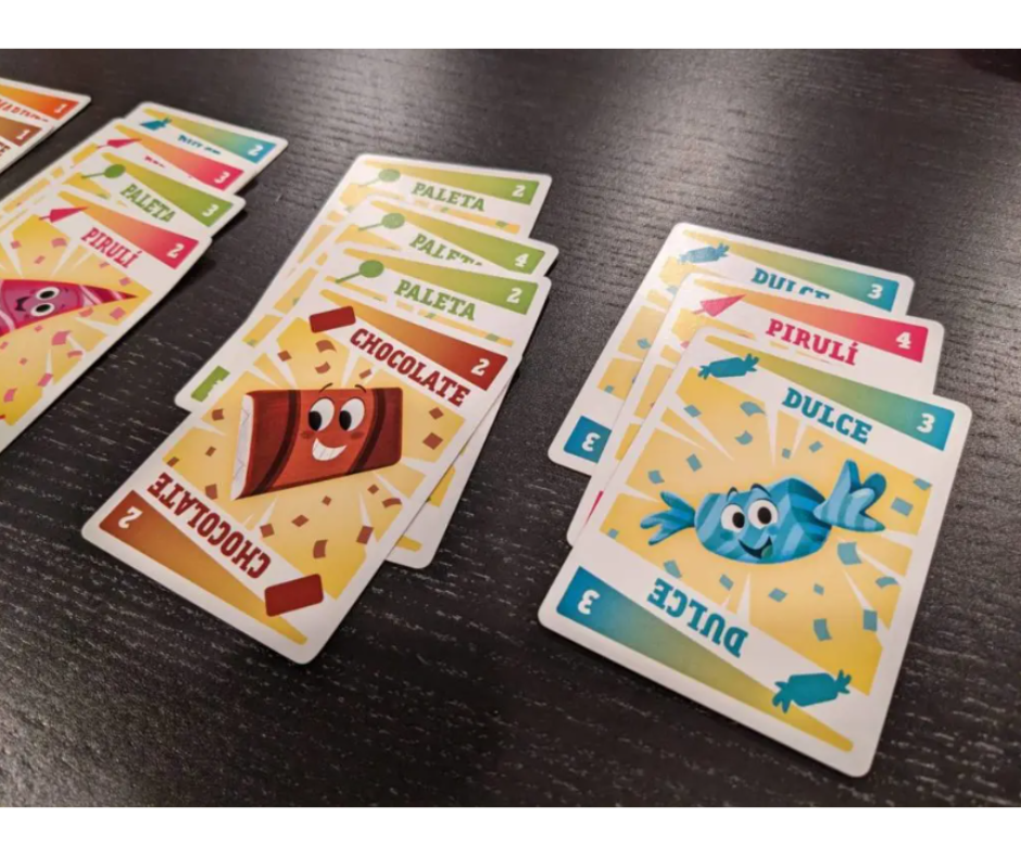 Cada cara del dado tiene un dulce, correspondiente a los de las cartas. Entonces al mismo tiempo todos tendrán que bajar cartas con el dulce correspondiente a algún dado, o sea, si salió un dado con un chocolate y tú tienes una carta con un chocolate, bajas la carta con el chocolate y tomas el dado, no al revés.