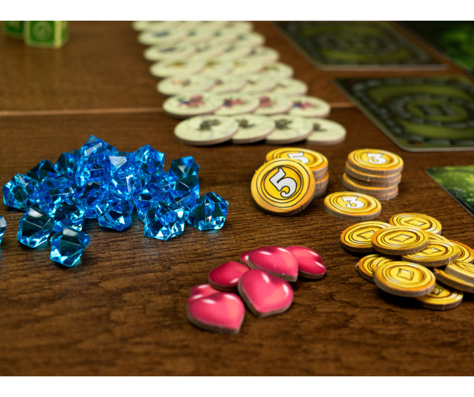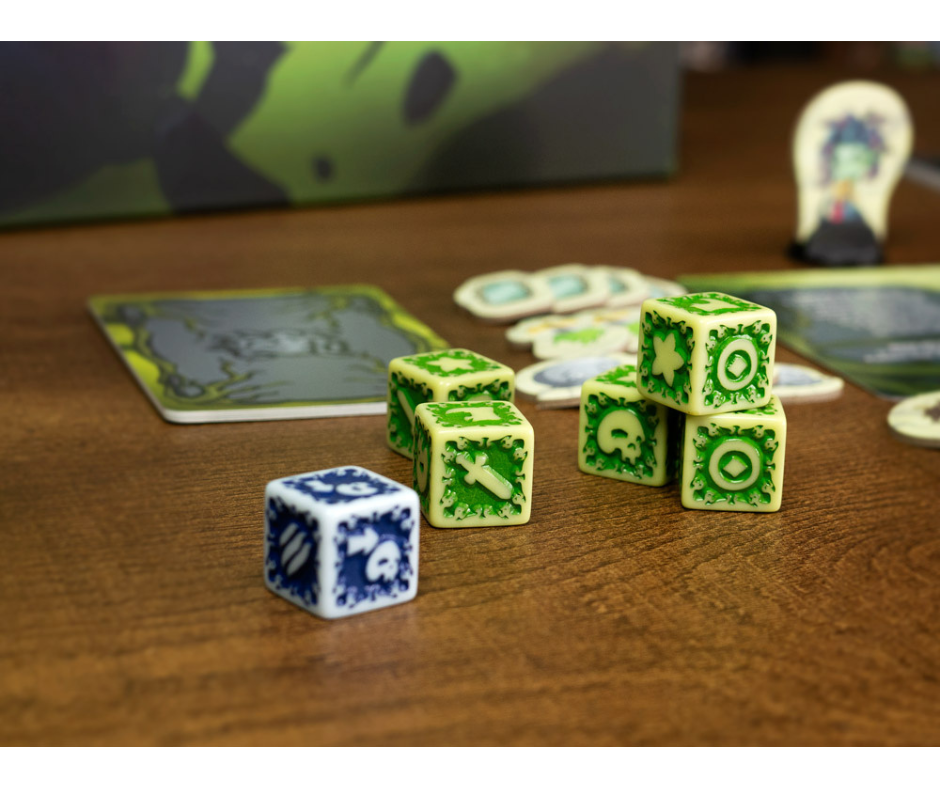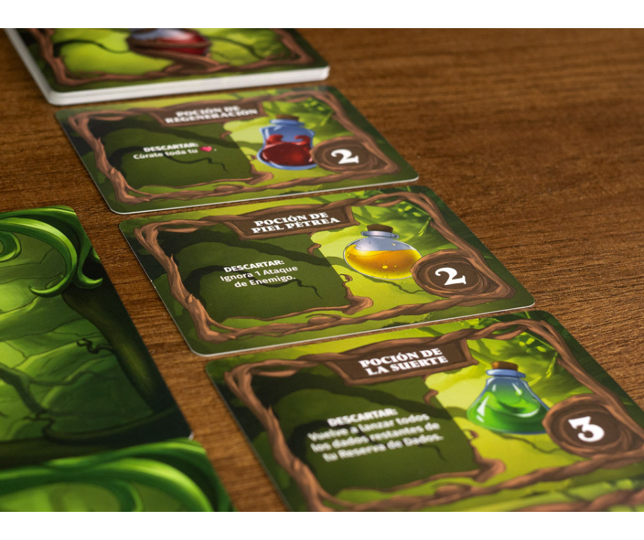 Cada movimiento que puedes hacer está determinado por los dados. Después de tirarlos, verás cuántos movimientos puedes hacer y cuáles. ¿No te gusta el resultado? ¡No te preocupes! ¡Cada dado puede volver a lanzarse una vez! Volviendo a las acciones, puede ser un salto, moverse un espacio, obtener una moneda de oro y mover o atacar a los monstruos. En general, no solo tienes que jugar con inteligencia, ¡sino que también se necesita un poco de suerte!