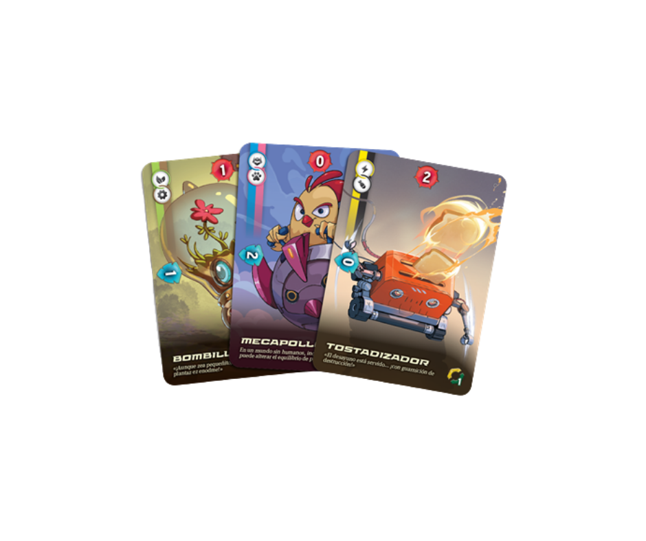 El arte del juego nos transporta a una Tierra donde la naturaleza ha reclamado su sitio y las máquinas son los nuevos reyes. Las cartas son claras, los iconos son intuitivos y el despliegue en mesa es impresionante.