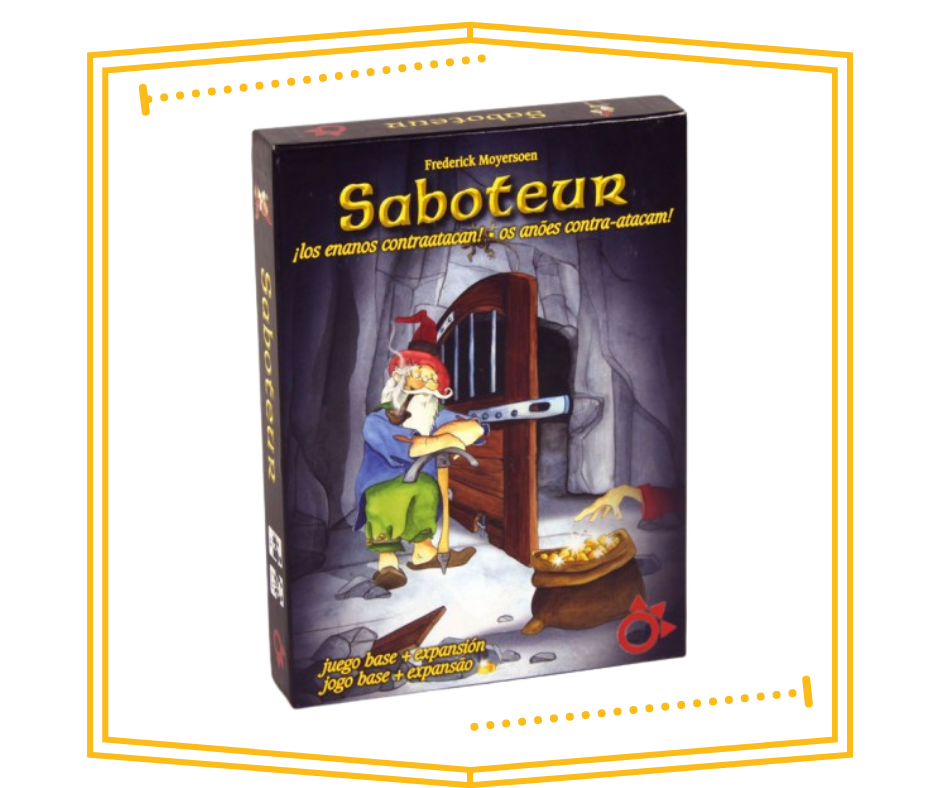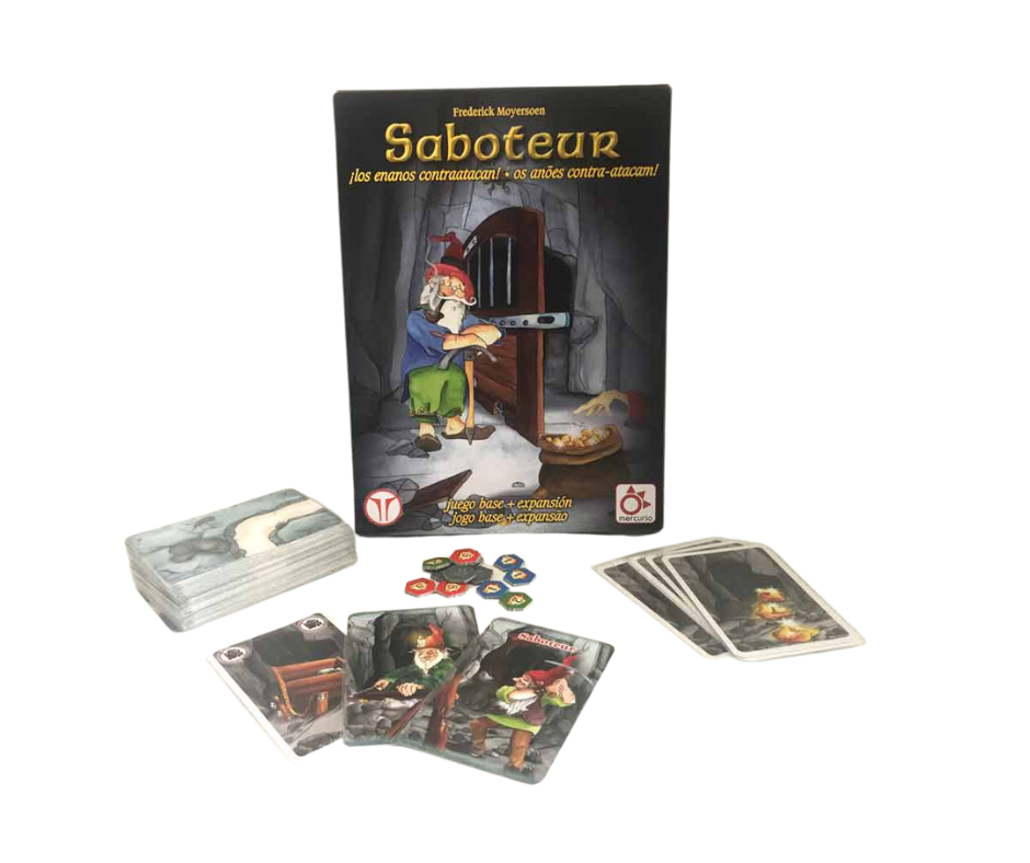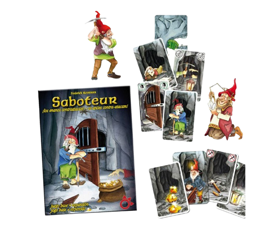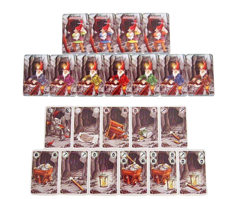 En Saboteur , cada jugador asume el papel de un enano buscador de oro o un saboteador que quiere obstaculizar la exploración de las minas de oro, pero cada jugador solo conoce su propio papel, por lo que la excavación puede salir o no según lo planeado.