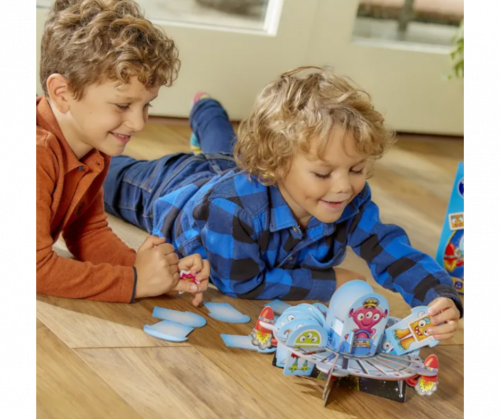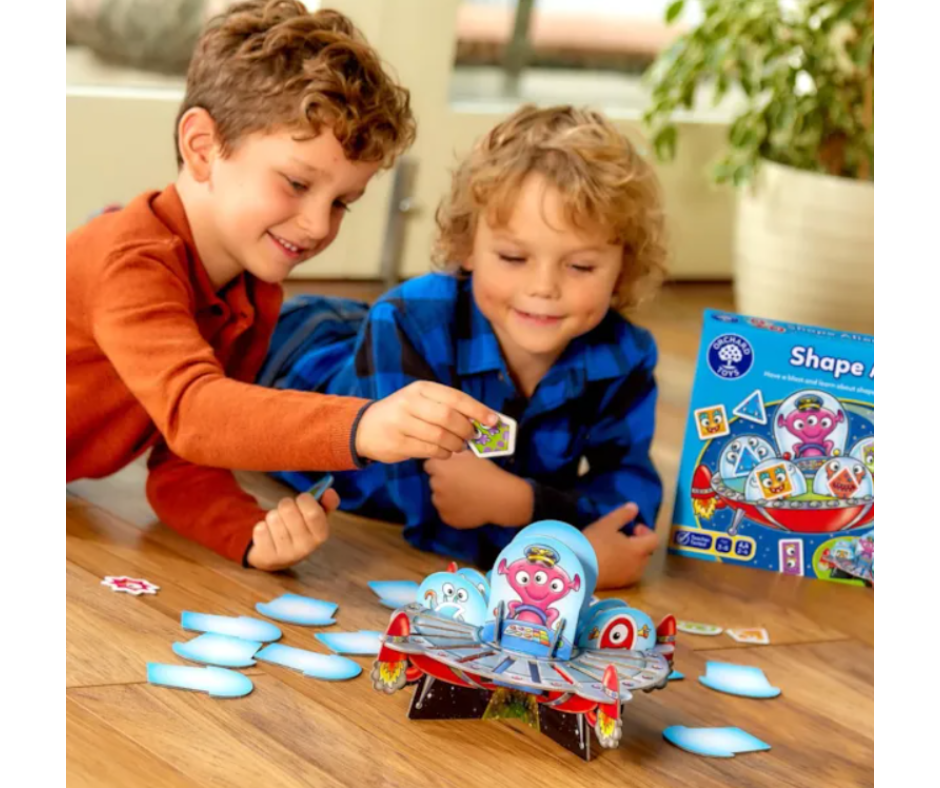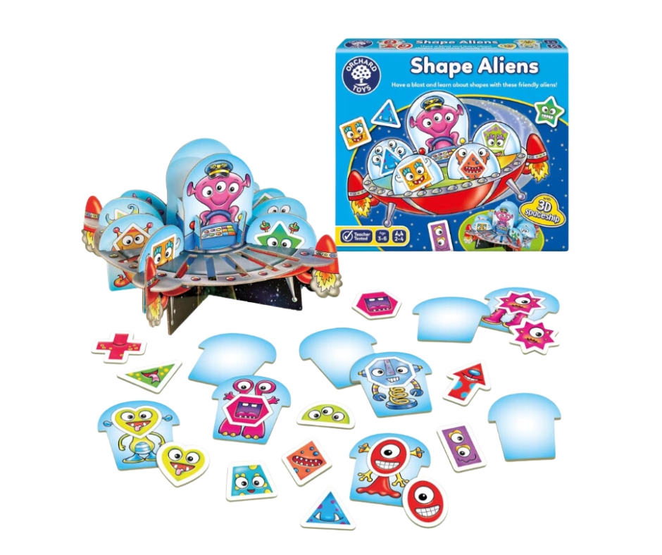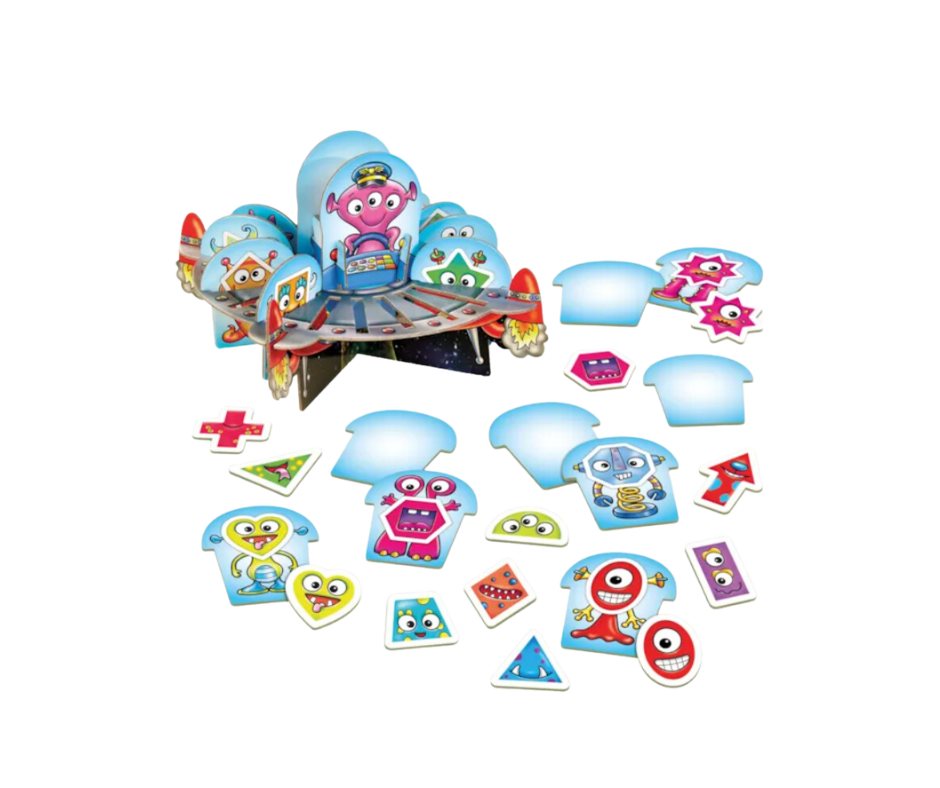 El objetivo es hacer coincidir las tarjetas de formas con los simpáticos extraterrestres. Una vez que encuentres una coincidencia, ¡lanza a tu alienígena a bordo de la nave espacial 3D, lista para despegar hacia las estrellas! El primer jugador que logre colocar a todos sus alienígenas en la nave gana la partida.