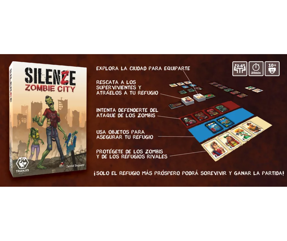 SilenZe: Zombie City es un juego de cartas ambientado en un apocalipsis zombi y con alta interacción. Nuestra misión es mantener nuestro refugio a salvo de los zombis e intentar acabar con el resto, para conseguir que nuestro refugio de supervivientes sea el más próspero y seguro.