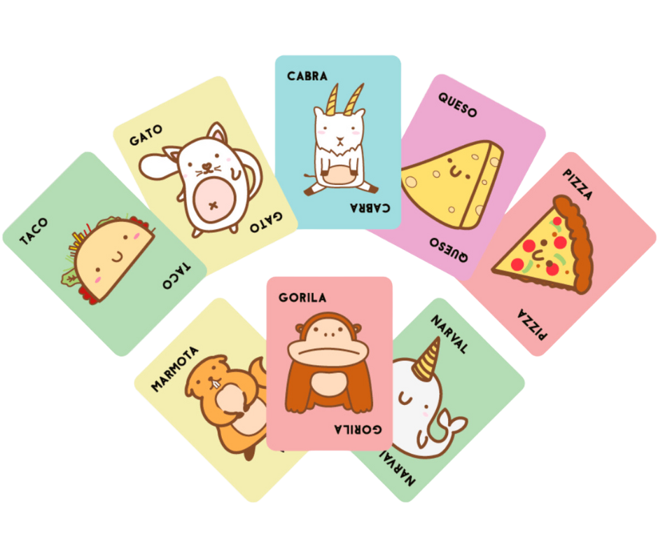 Memoriza estas palabras en orden: Taco, Gato, Cabra, Queso, Pizza. Cada jugador recibe 8 cartas y uno por uno pondrá una carta sobre la mesa diciendo una palabra en el orden correspondiente. Tan rápido como puedan, los jugadores darán un manotazo sobre la pila de cartas cuando la imagen y la palabra coincidan. El último en reaccionar se lleva la pila de cartas acumuladas. Mantente alerta, ¡porque si salen la cartas especiales de marmota, narval o gorila, tendrás que hacer pantomimas!
