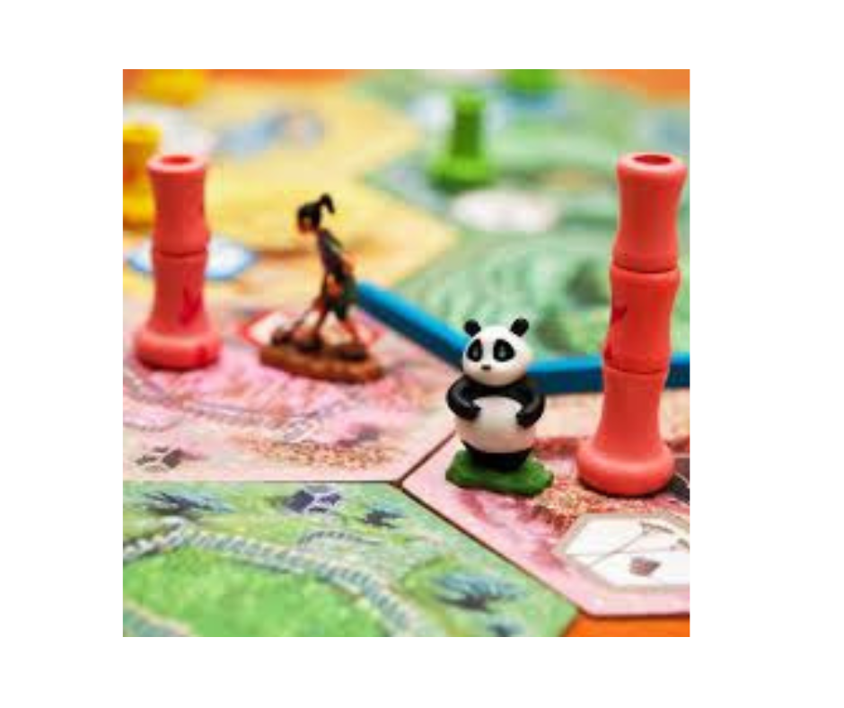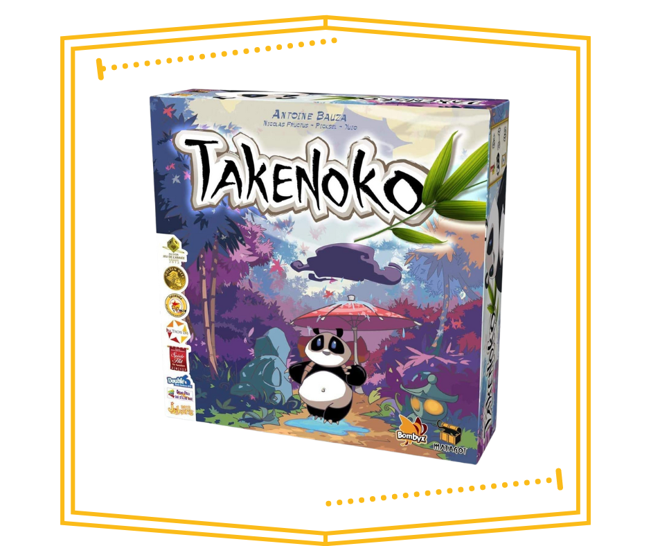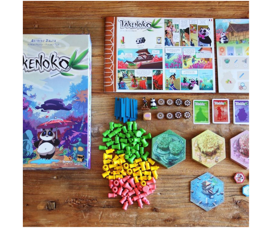 En Takenoko , los jugadores cultivarán terrenos, los irrigarán y cultivarán una de las tres especies de bambú (verde, amarillo y rosa) con la ayuda del jardinero imperial para mantener este jardín de bambú. Tendrán que soportar el hambre desmedida de este animal sagrado por el jugoso y tierno bambú. El jugador que administre mejor sus terrenos, cultivando la mayor cantidad de bambú mientras alimenta el delicado apetito del panda, ganará el juego.