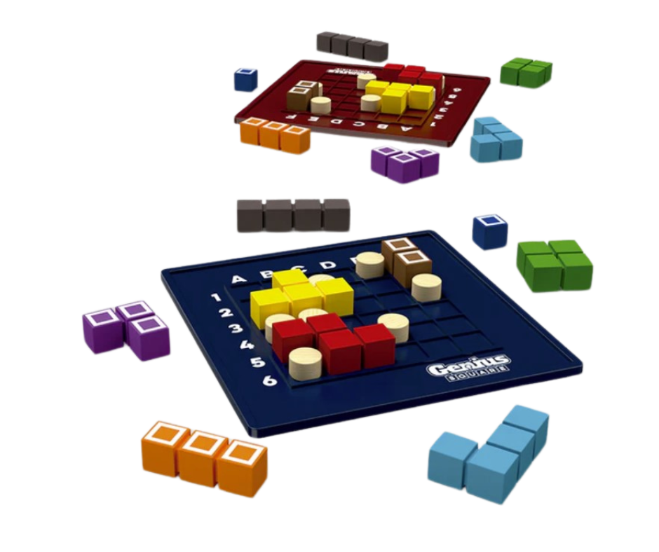 Piensa rápido para resolver los desafíos antes de que tu contrincante. Tira los dados, coloca los 7 cuadros blancos a los que llamaremos “bloqueadores” en el tablero de juego y completa el cuadrado usando las 9 piezas del rompecabezas restantes. No olvides que la piezas blancas no se deben mover luego de colocarlas en el tablero.