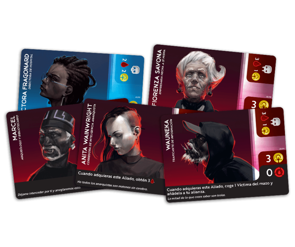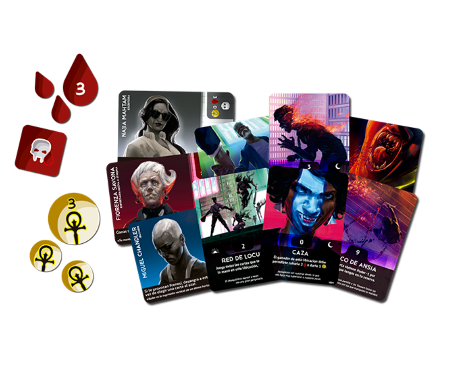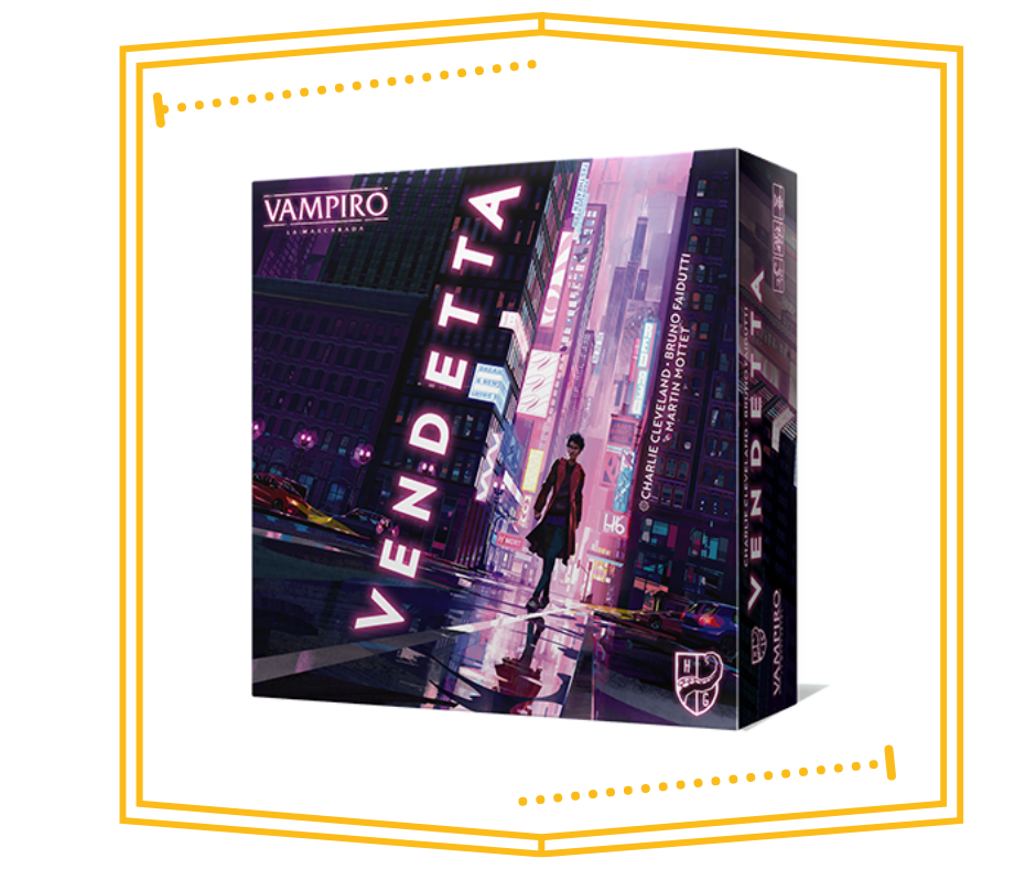 En Vampiro: La Mascarada – Vendetta, jugaremos cartas en diferentes localizaciones de la ciudad para controlar poderosos aliados y así ganar acceso a sus poderosas habilidades, pero también influencia en un juego en el que las puñaladas (y los mordiscos) por la espalda están a la orden del día.
